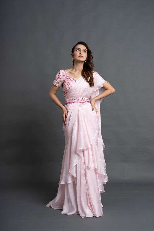Millennial Pink Pre-Draped Saree with Embellished Blouse