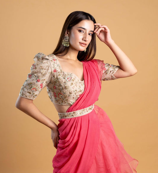 Yellow Drape Skirt Set with Mirror Work Blouse & Cape