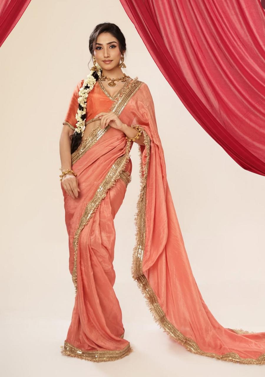 Our Agnika pre-draped saree, crafted in luminous tissue fabric with a gleaming gold border, embodies that ethereal radiance — light as air, yet powerful in presence.