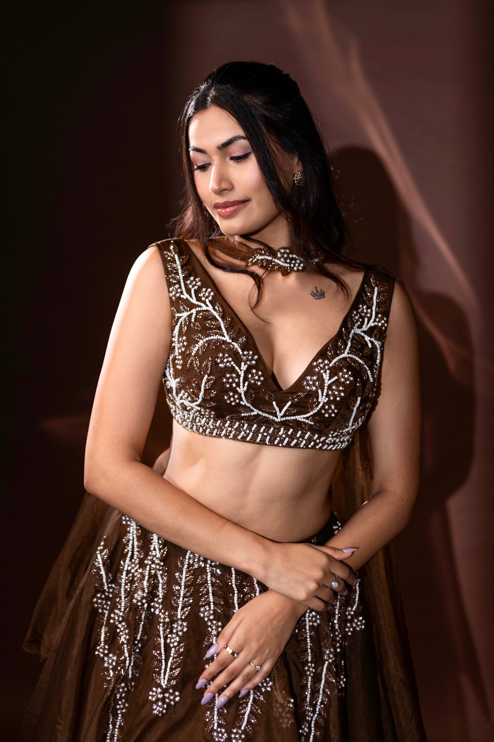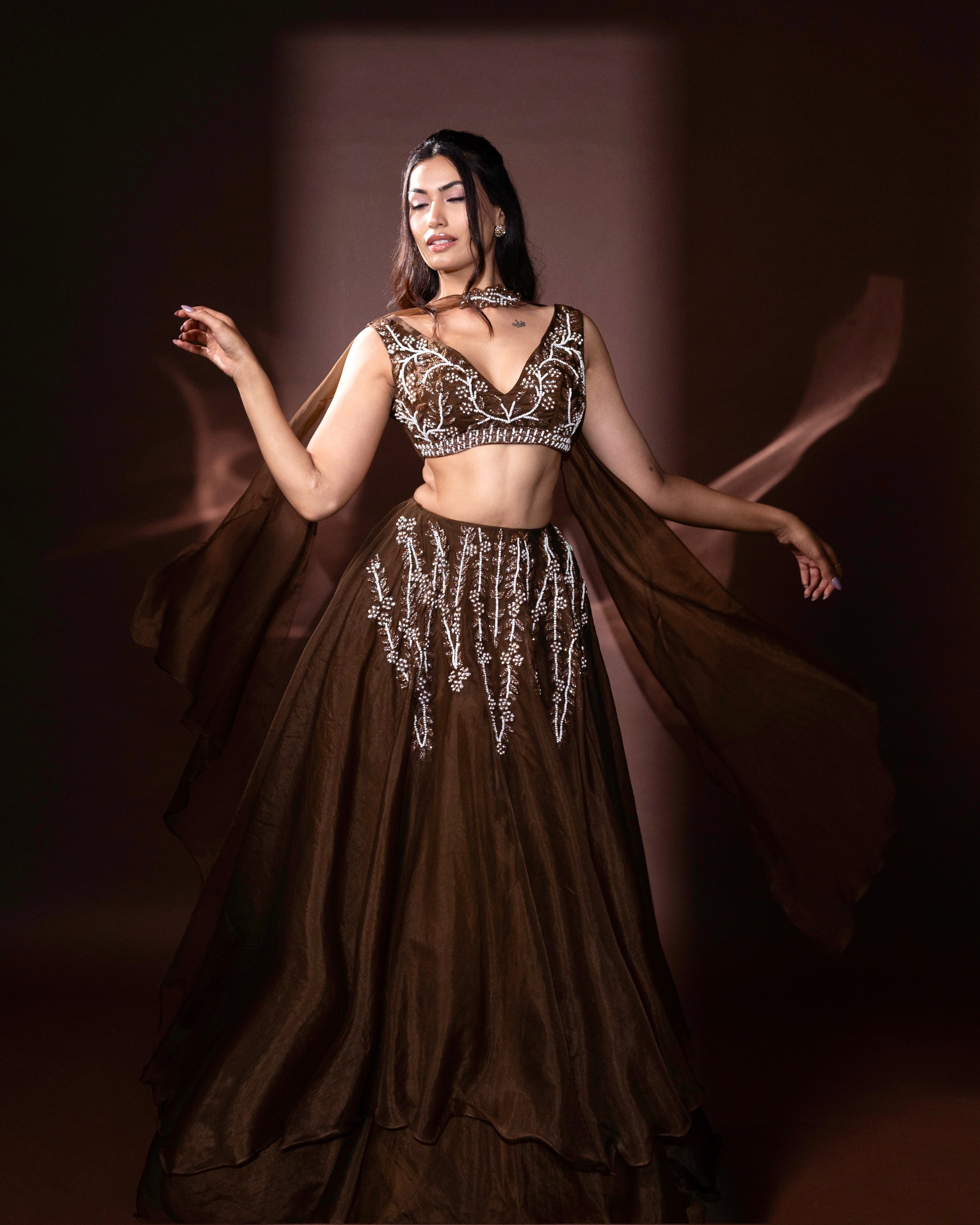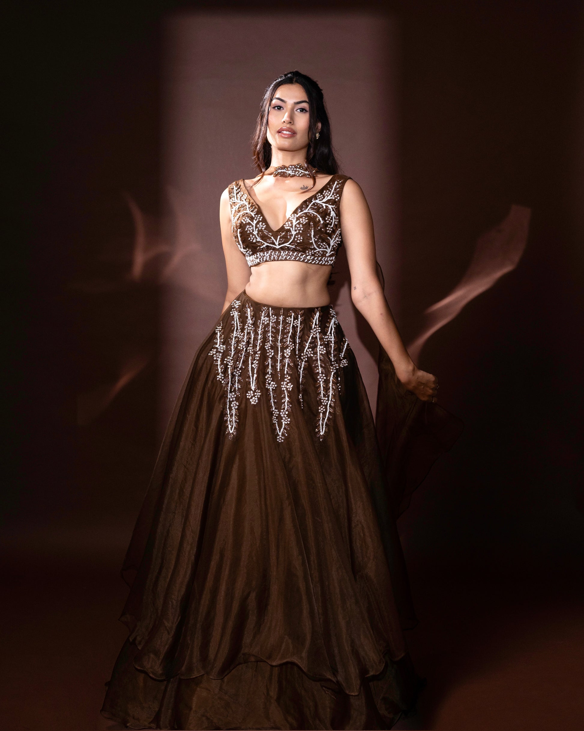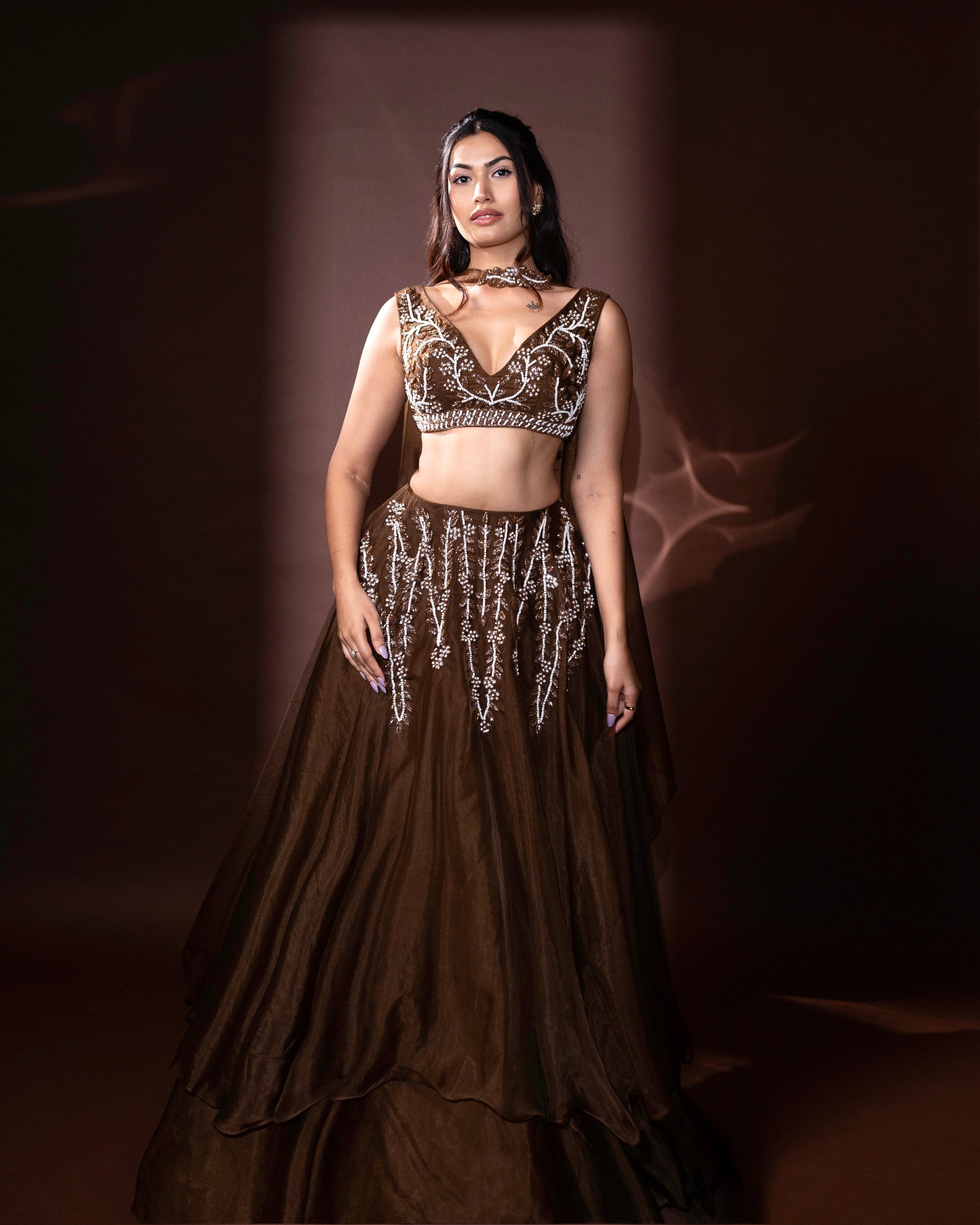 Drenched in deep brown hues, the Ambar Lehenga is a quiet celebration of grandeur. The blouse and lehenga are brought to life with hand-embroidered Kadana beads and crystals, catching the light with every step. Two fluid layers of organza lend volume and movement, creating a dreamy silhouette. The look is completed with a choker-style dupatta, embroidered with finesse—adding just the right touch of drama.