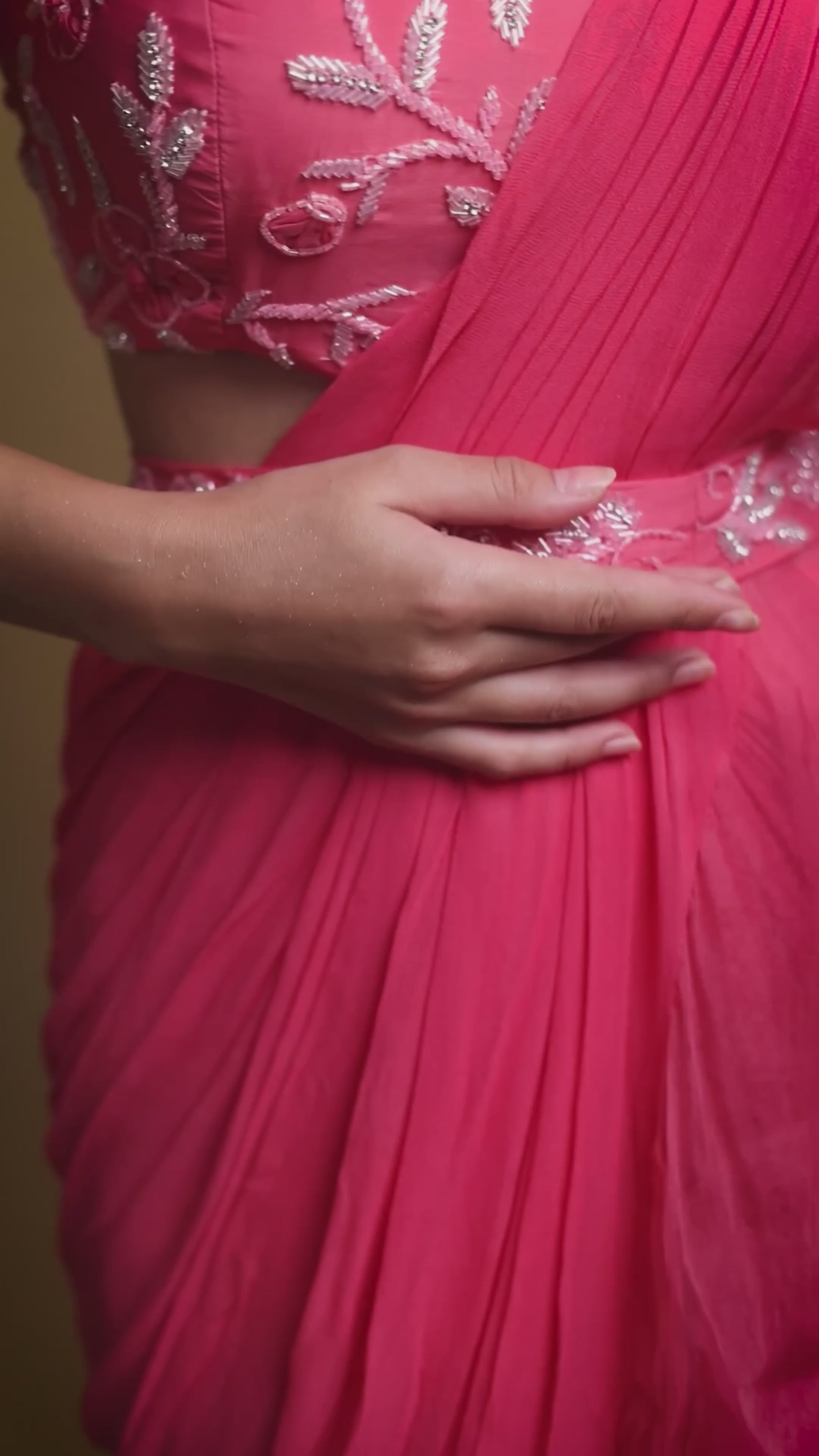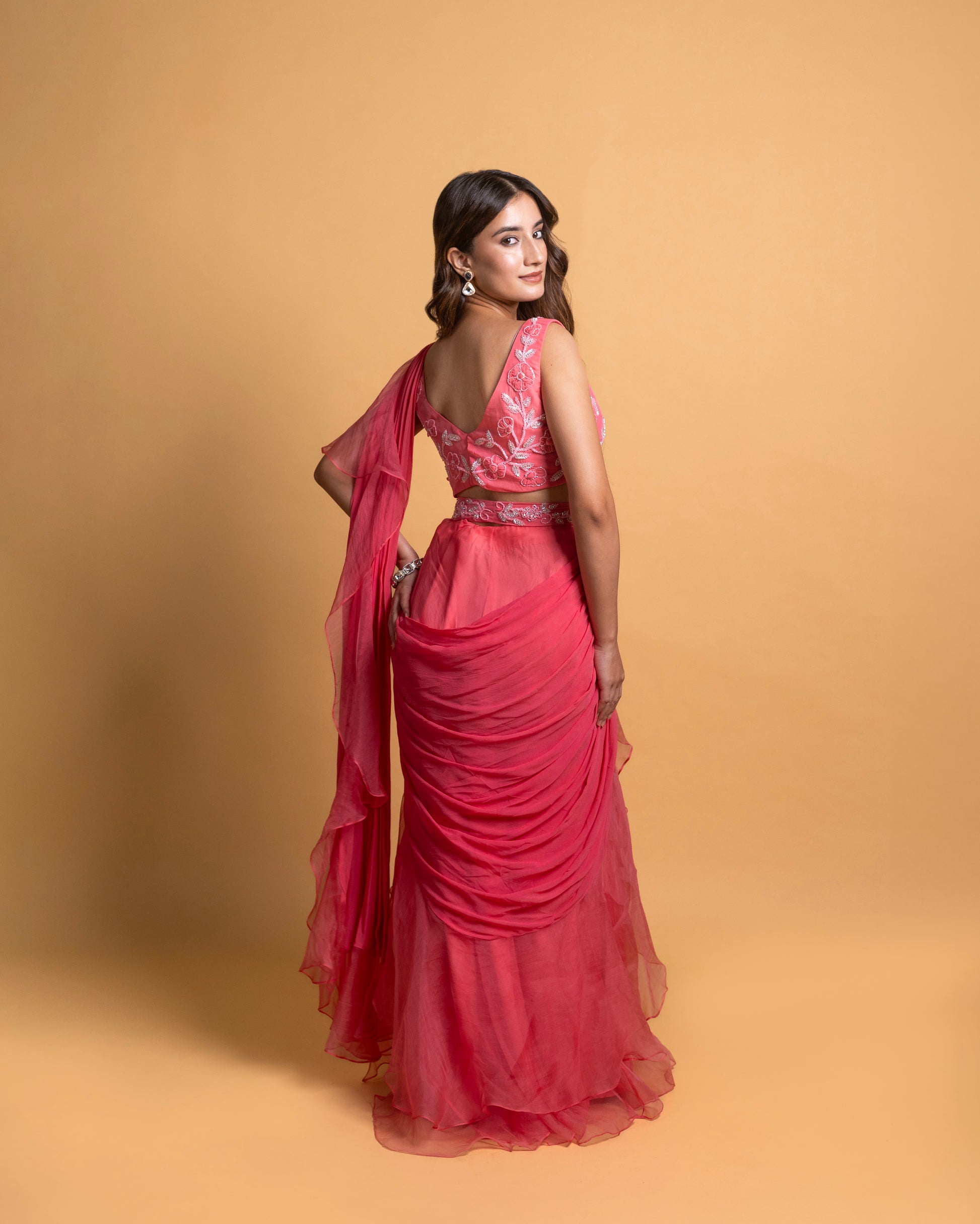 The Beatrice Saree is a stunning creation made from a blend of organza and georgette fabrics, offering a graceful and fluid drape. It is adorned with delicate cutdana embroidery and beautiful fabric flowers, adding intricate texture and a touch of luxury. This combination creates a perfect balance of softness, elegance, and detailed craftsmanship, ideal for weddings or special occasions.
