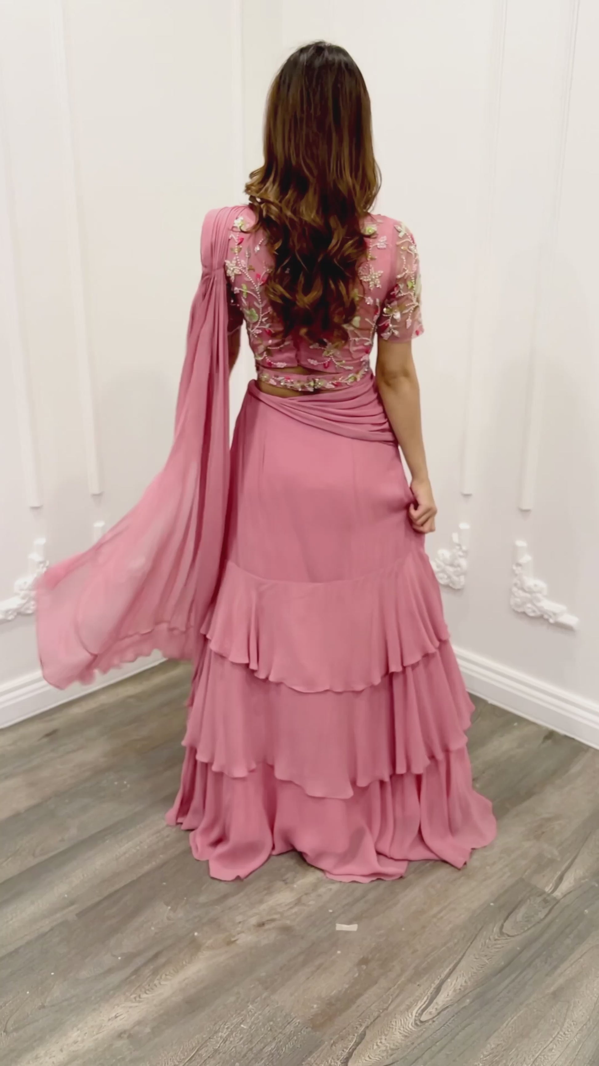 This coral georgette pre-draped lehenga saree, paired with a net blouse featuring thread and cutdana embroidery, offers a perfect blend of elegance and ease. The flowing saree and intricately designed blouse.
