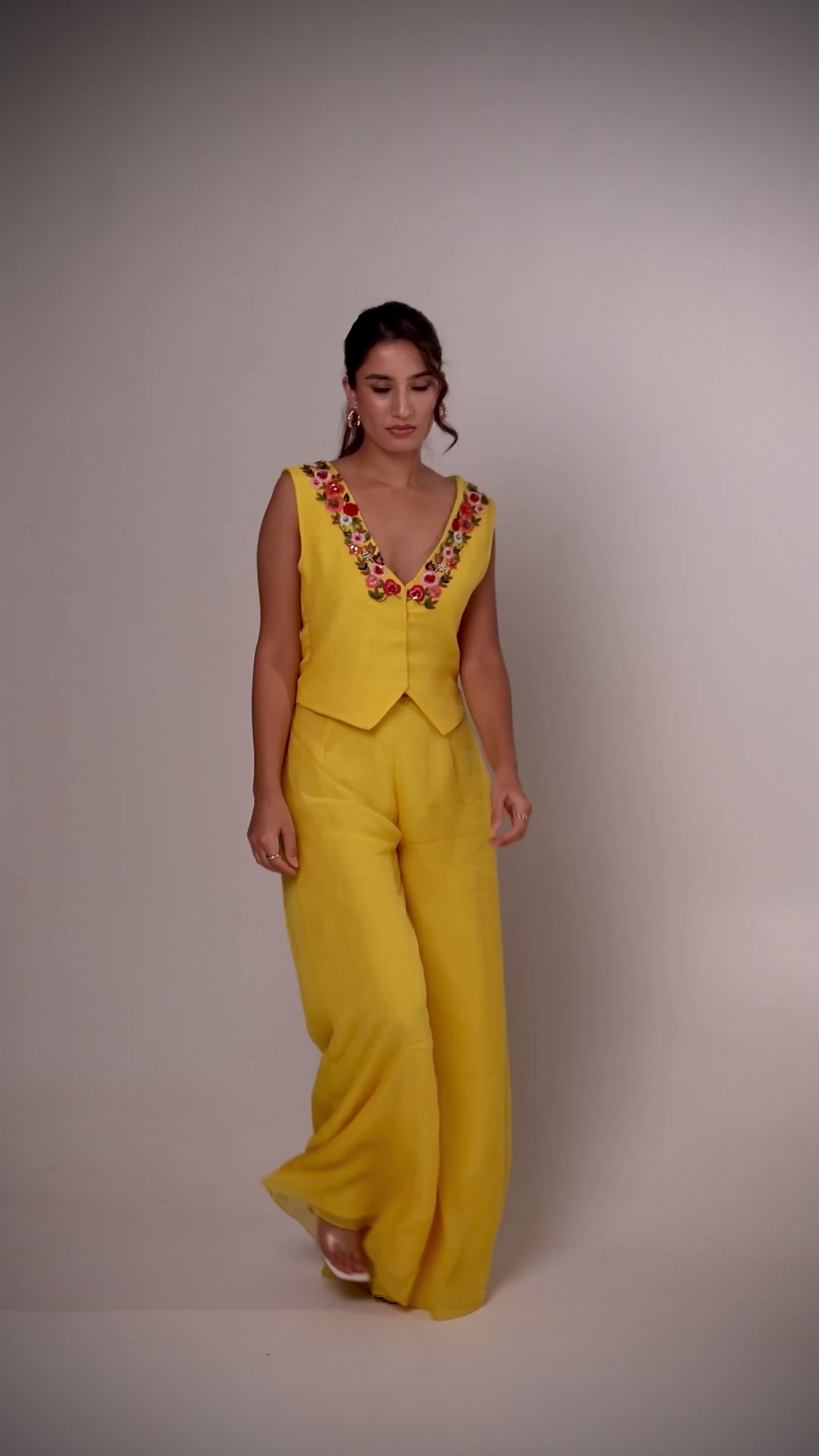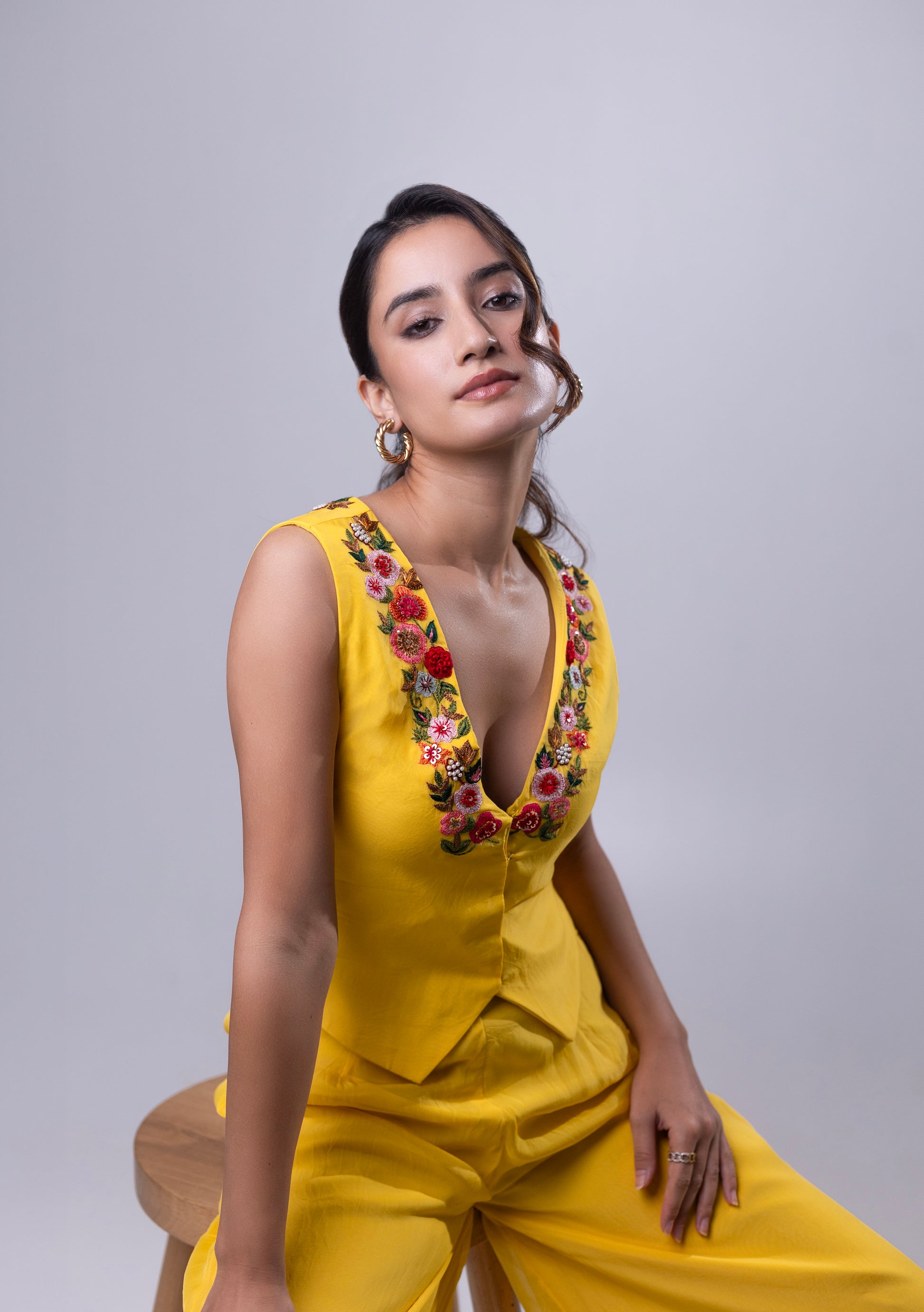 A Daisy Pant Set in Yellow Organza Fabric with Thread Work Around the Neck is a cheerful and elegant choice. The lightweight organza fabric adds a delicate, airy feel, while the detailed thread work around the neckline enhances its beauty