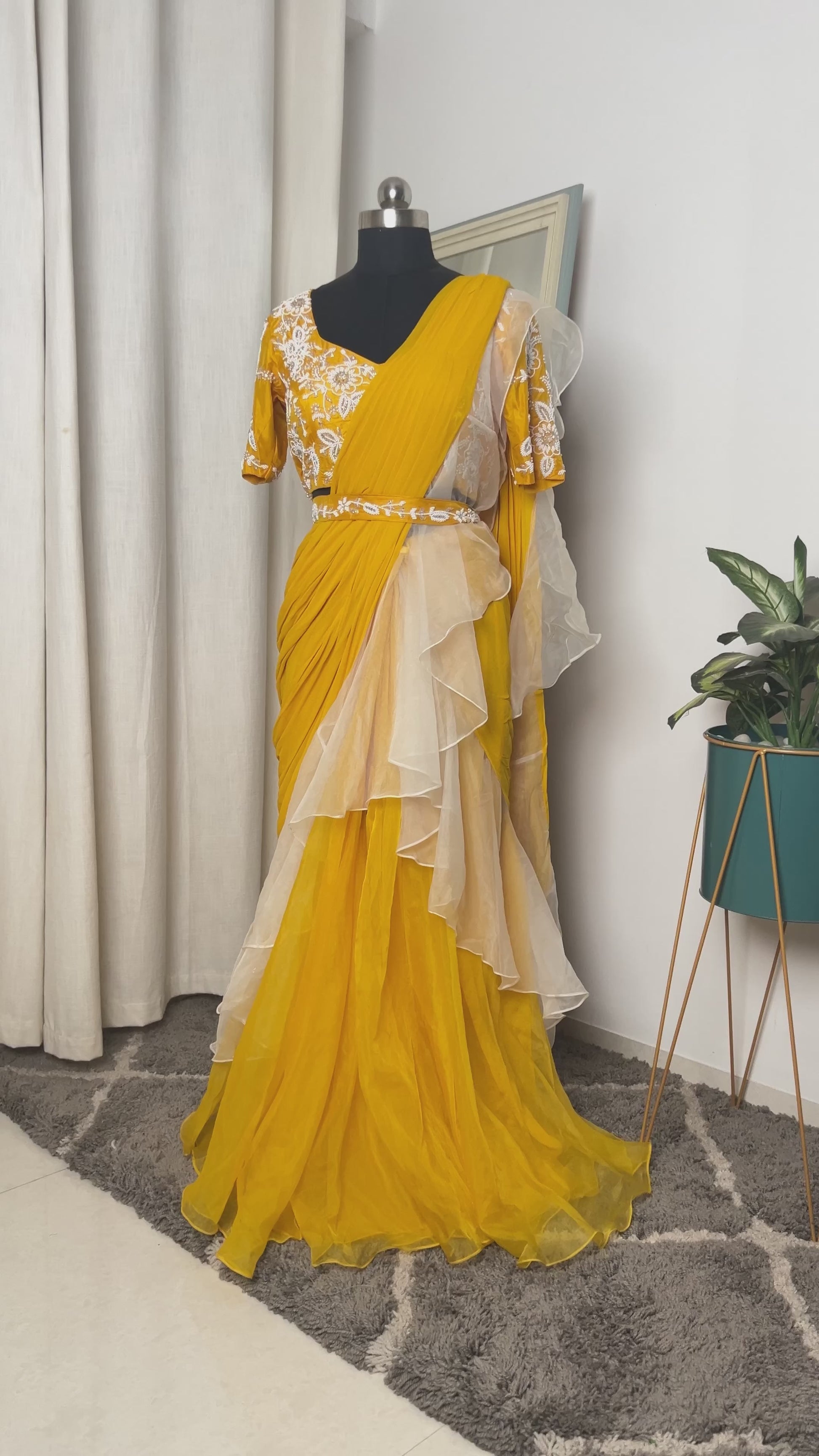 Turn heads in this mustard pre-draped saree with dreamy ivory organza ruffles, crafted in airy georgette and organza. Paired with a heavy embroidered silk blouse richly embellished with white beads, sequins, and cutdana, and finished with an embroidered belt—this look is perfect for haldi glam, mehendi moments, or festive day events.