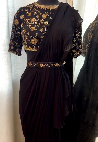 This elegant black saree set blends traditional artistry with a modern silhouette. Crafted in soft georgette, the saree features a fluid, graceful drape that flatters every movement. It is paired with a net blouse, intricately embroidered with golden zari work, sequins, and cutdana, adding richness and festive charm. A matching embroidered waist belt completes the look with a touch of structure and sophistication.
