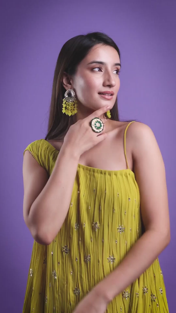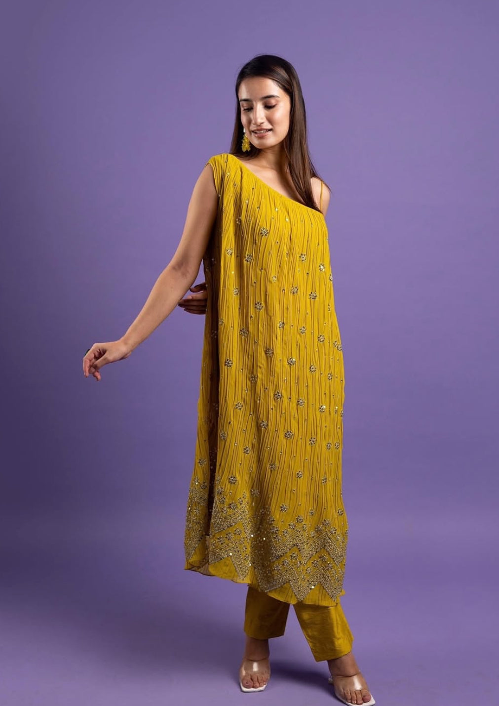 A lime one-shoulder suit crafted from luxurious georgette fabric, adorned with intricate silver thread work, offers a striking blend of modern chic and timeless elegance. The asymmetrical one-shoulder cut adds a contemporary edge, while the shimmering silver embroidery lends a refined, intricate touch