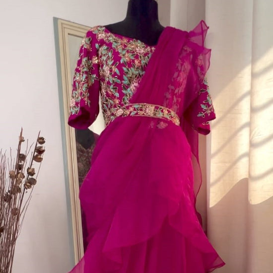 Flaunt festive glam in this magenta pre-draped ruffle saree in organza, paired with a silk blouse adorned in vibrant contrast thread embroidery. Finished with a chic embellished belt, it’s your go-to for weddings, sangeets, and festive occasion.