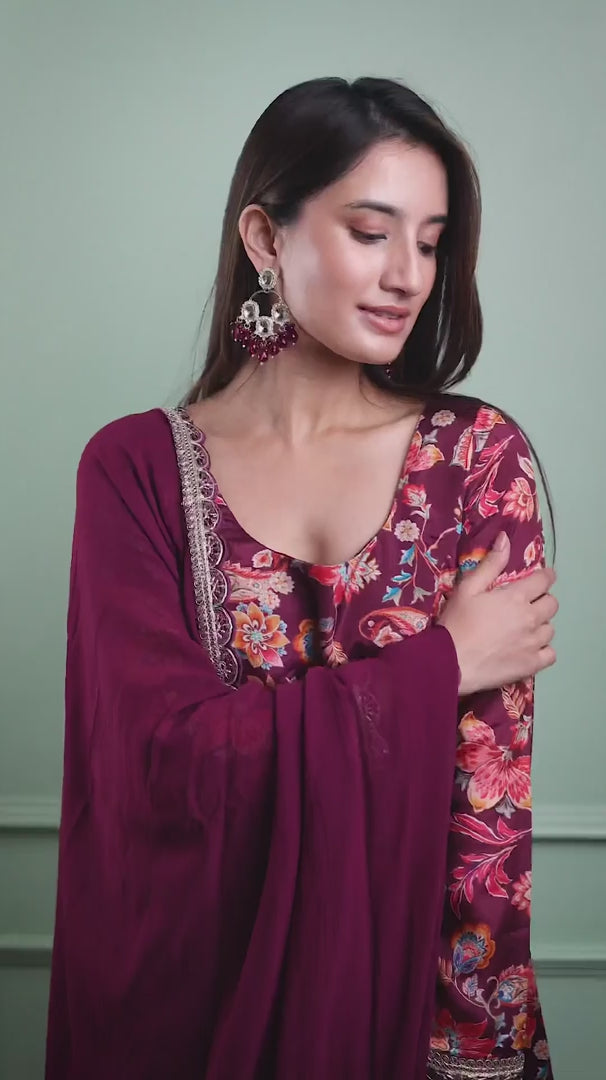 The Naksh wine Anarkali, featuring a beautifully printed fabric, exudes regal charm and elegance. The rich wine hue, paired with intricate prints, creates a stunning visual contrast, while the flowing Anarkali silhouette adds a graceful touch. The accompanying dupatta, with its delicate border, enhances the overall look.