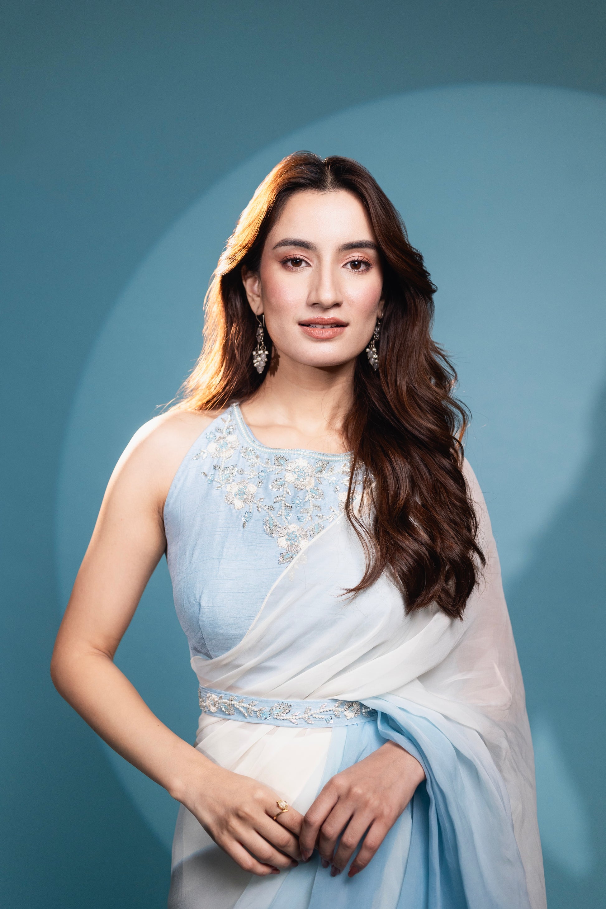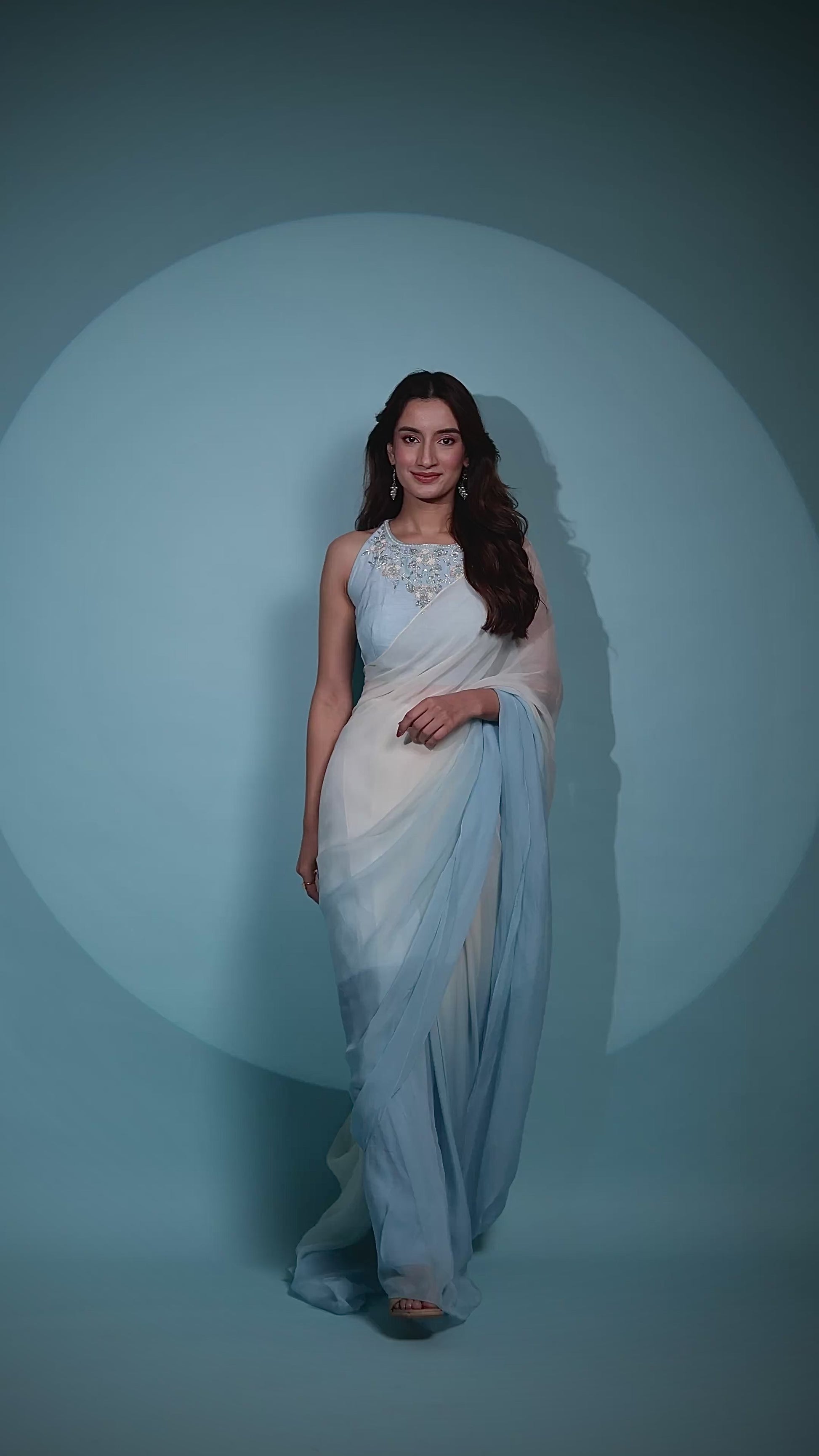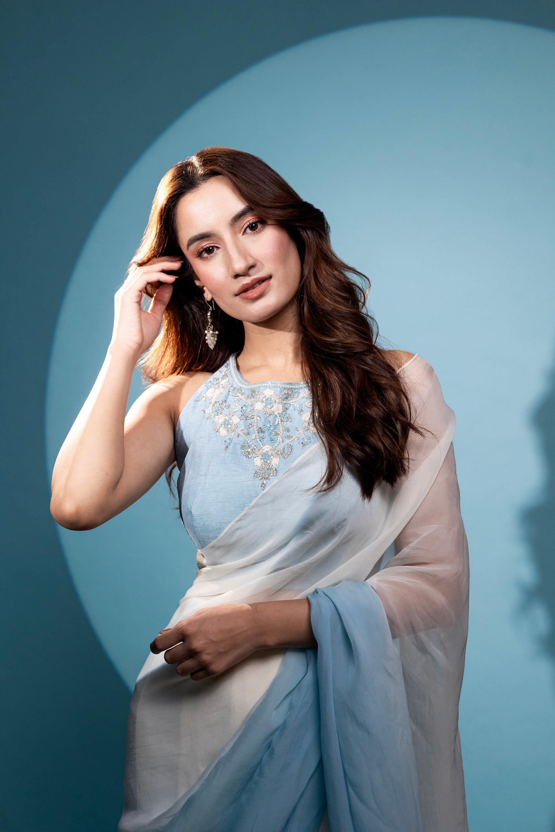 Presenting the Neelam soft organza saree — a delicate dual-tone drape paired with a stunning blue silk blouse, featuring necklace-style embroidery around the neckline. Breezy, weightless, and crafted for an effortless look.