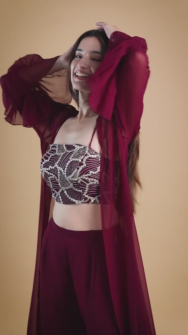 The Noor Wine Cape Set features a beautifully embroidered blouse with thread and mirror work, paired with a graceful georgette jacket and sleek pants. This elegant ensemble blends modern style with traditional charm, perfect for weddings or festive occasions.