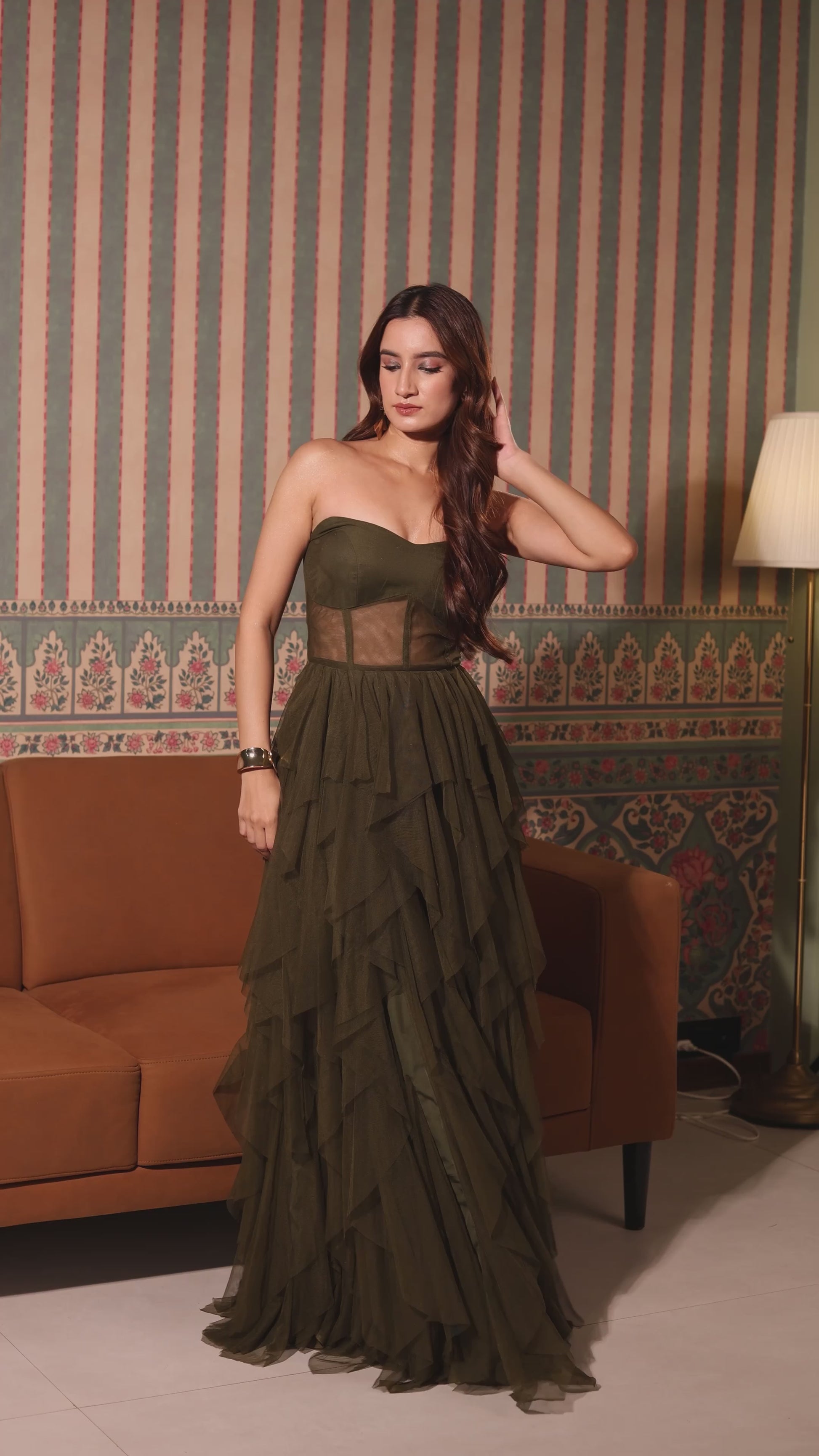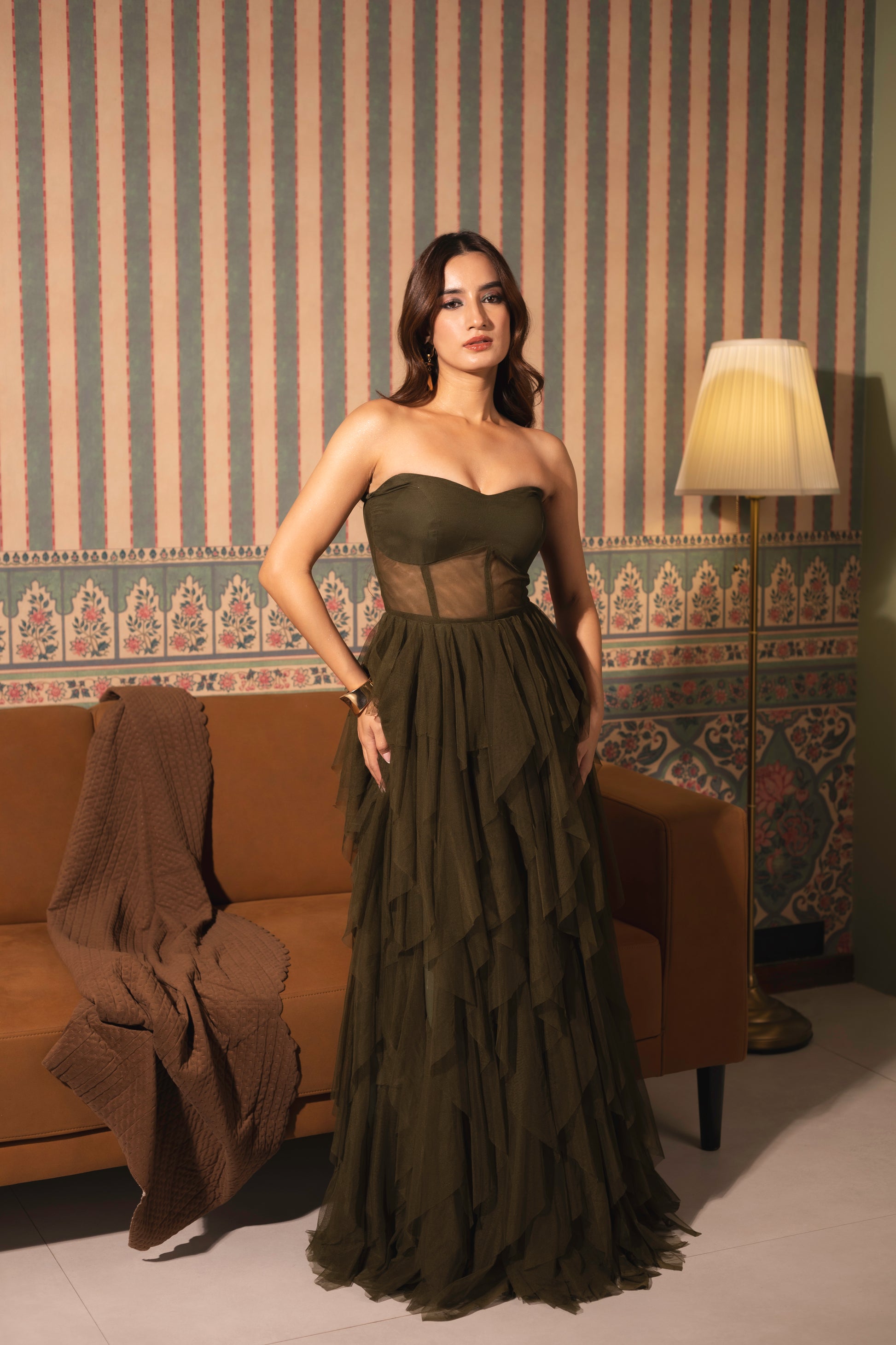 An Olive Soft Net Frill Gown is the epitome of glamour and style, with its flowing net fabric and playful frill details. The soft, textured material adds depth and fluidity, making it a perfect choice for upscale events, evening parties, or cocktail gatherings.
