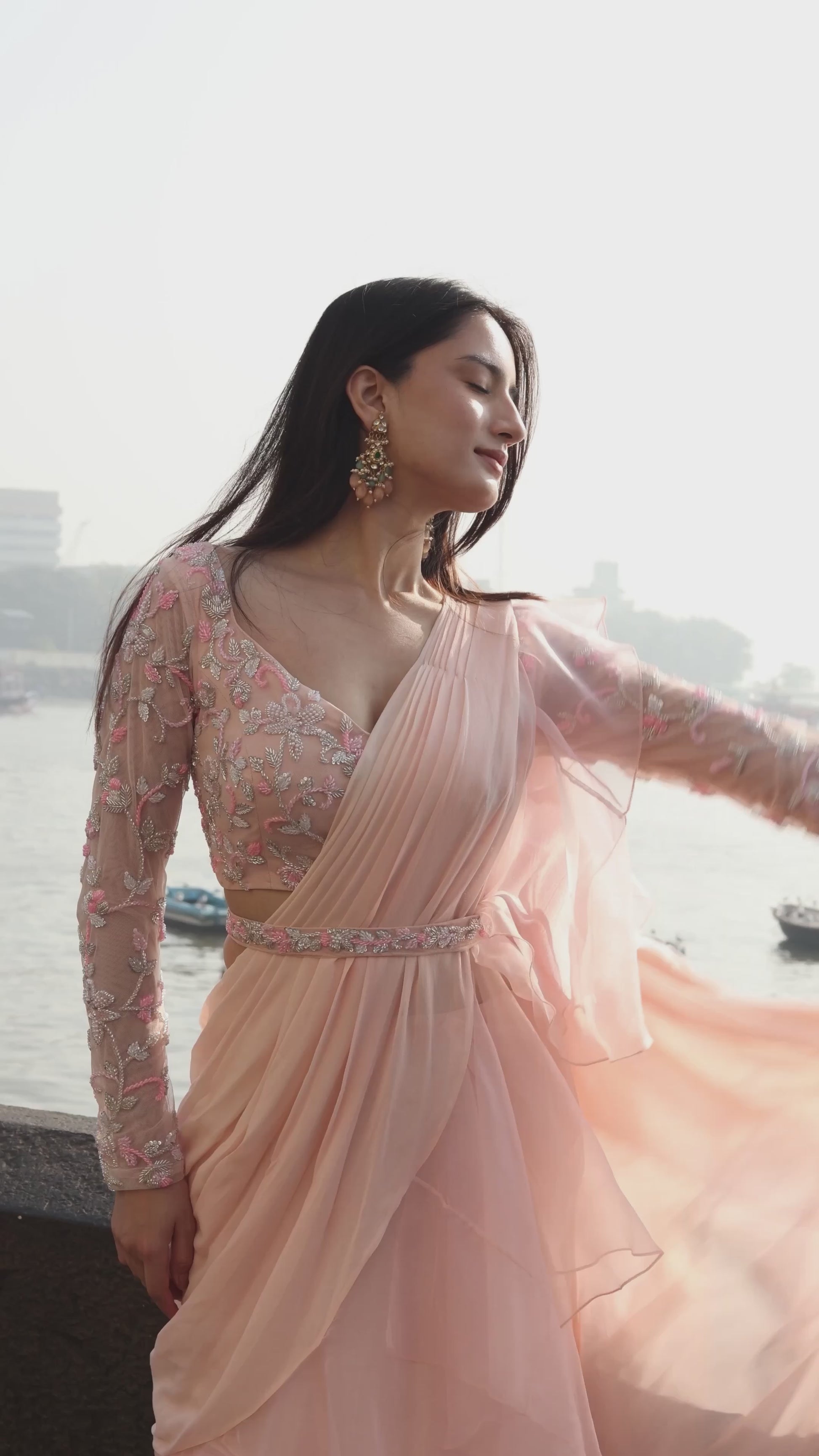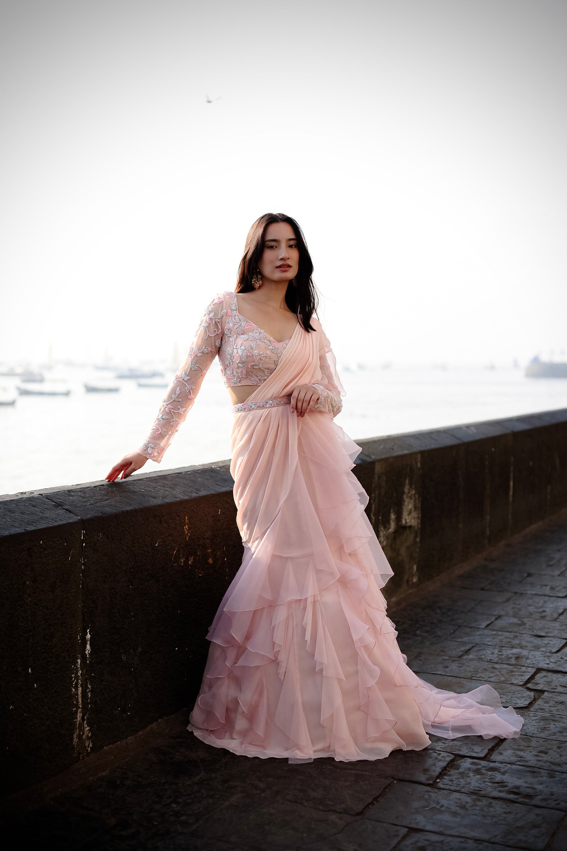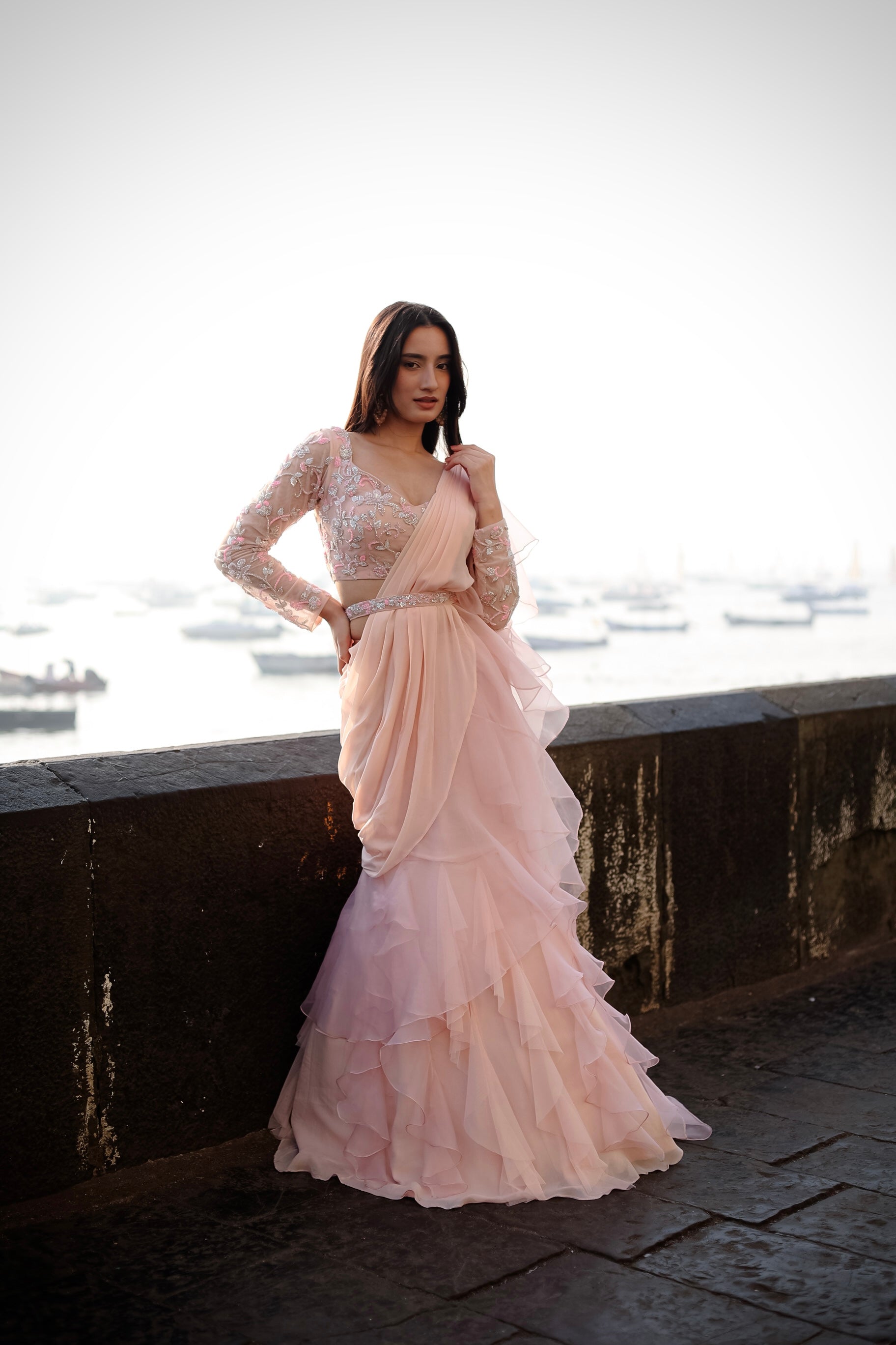 The Tiffany Saree is a beautiful blend of organza georgette and soft net in a pre-draped style, designed to flow with an ethereal, dream-like quality. The saree drapes effortlessly, offering a delicate, graceful silhouette. The accompanying soft net blouse is intricately embroidered with cutdana, beads, and pearls, bringing timeless elegance and luxurious detail to the ensemble. With its soft textures and exquisite craftsmanship, the Tiffany Saree is perfect for creating a magical, unforgettable look for any special occasion.
