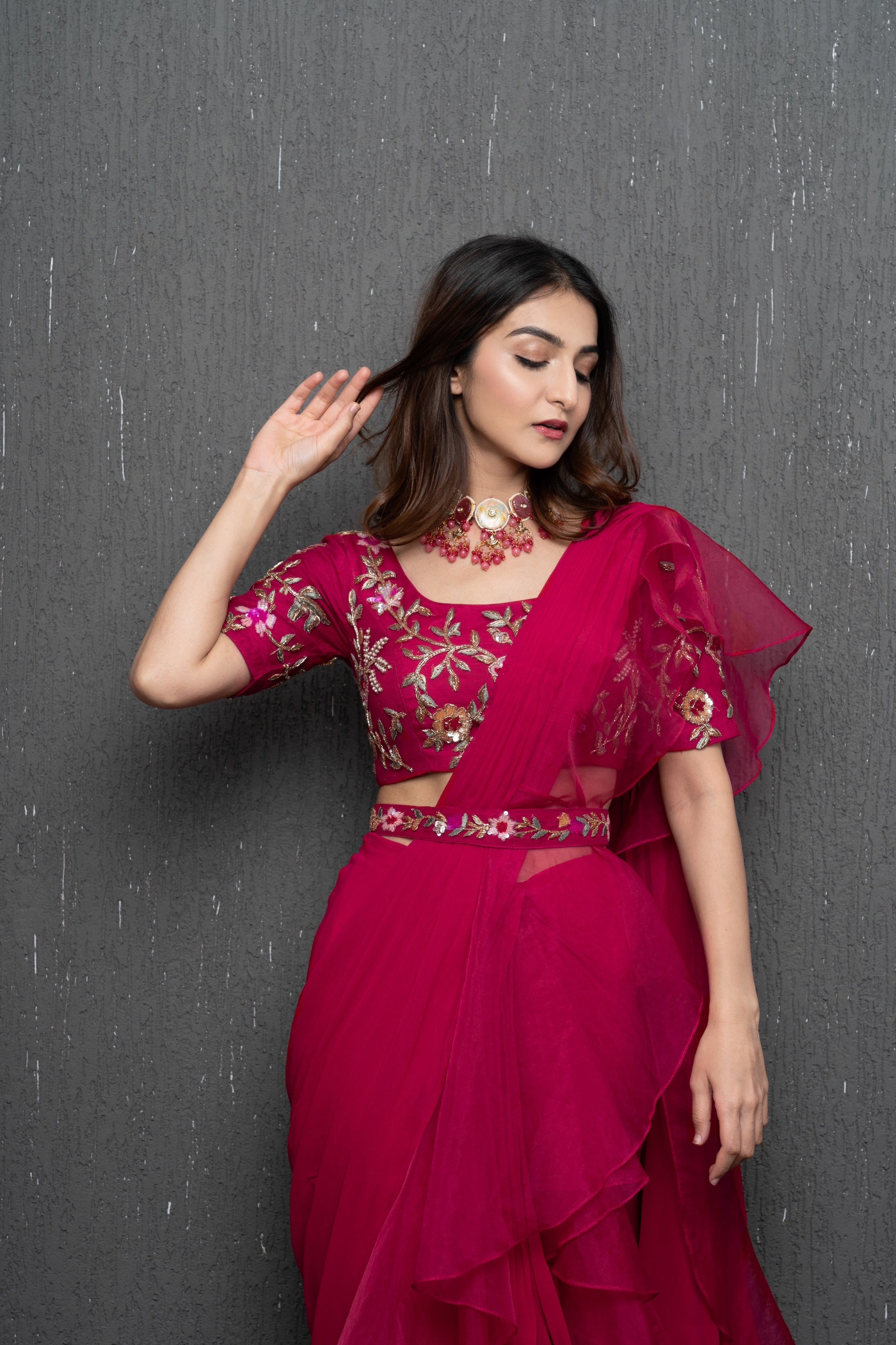 Presenting this stunning rose pink pre-draped saree, a masterpiece of elegance and ease. Crafted from soft organza and georgette, its effortless drape offers timeless style with modern comfort. Paired with a silk blouse adorned with intricate threadwork, shimmering beads, delicate pearls, zari, and cutdana embroidery, this ensemble exudes charm and sophistication. Perfect for weddings, receptions, and festive celebrations, it’s designed to make you shine on your special occasion.