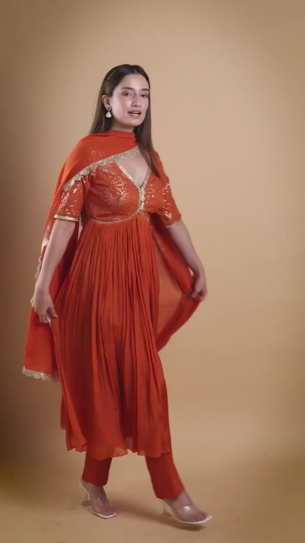The rust orange Anarkali in chinon crepe fabric is a perfect blend of warmth and elegance, featuring intricate gold thread work that adds a touch of opulence. The flowing silhouette of the Anarkali enhances its graceful charm, while the dupatta with a delicate border complements the outfit beautifully.