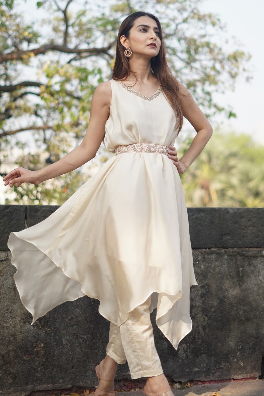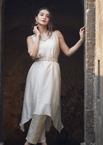 A Satin Georgette Suit with Pants and an Embroidered Belt offers a luxurious look. The smooth satin georgette fabric provides comfort, while the tailored pants add a sleek touch. The embroidered belt adds intricate detail.