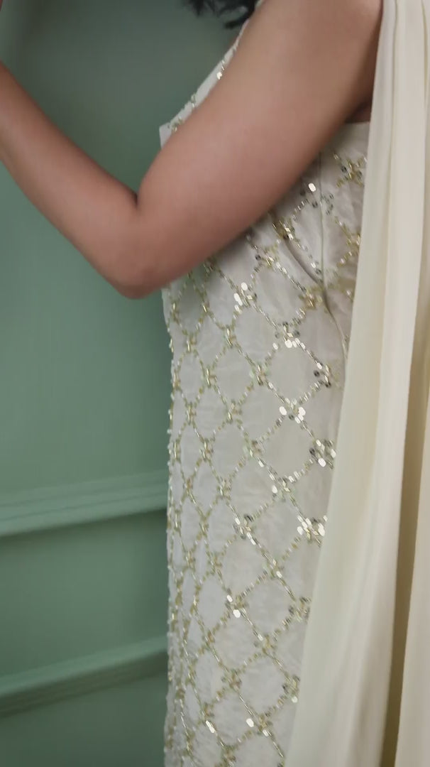 The Sitara white suit, made from luxurious tissue fabric, is beautifully adorned with intricate cutdana and beadwork, creating a refined, sparkling effect. The graceful georgette dupatta and comfortable palazzo pants complete the look