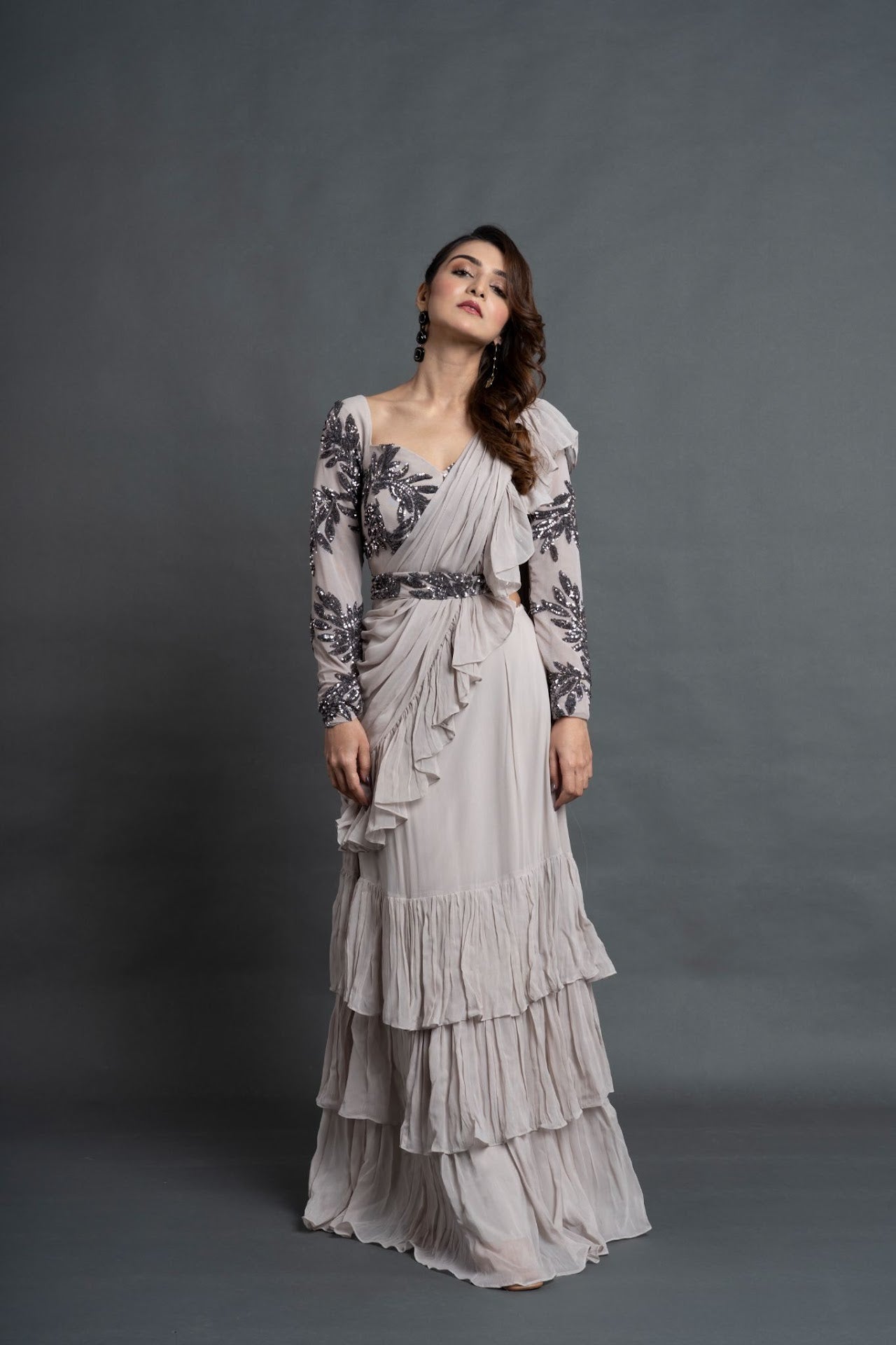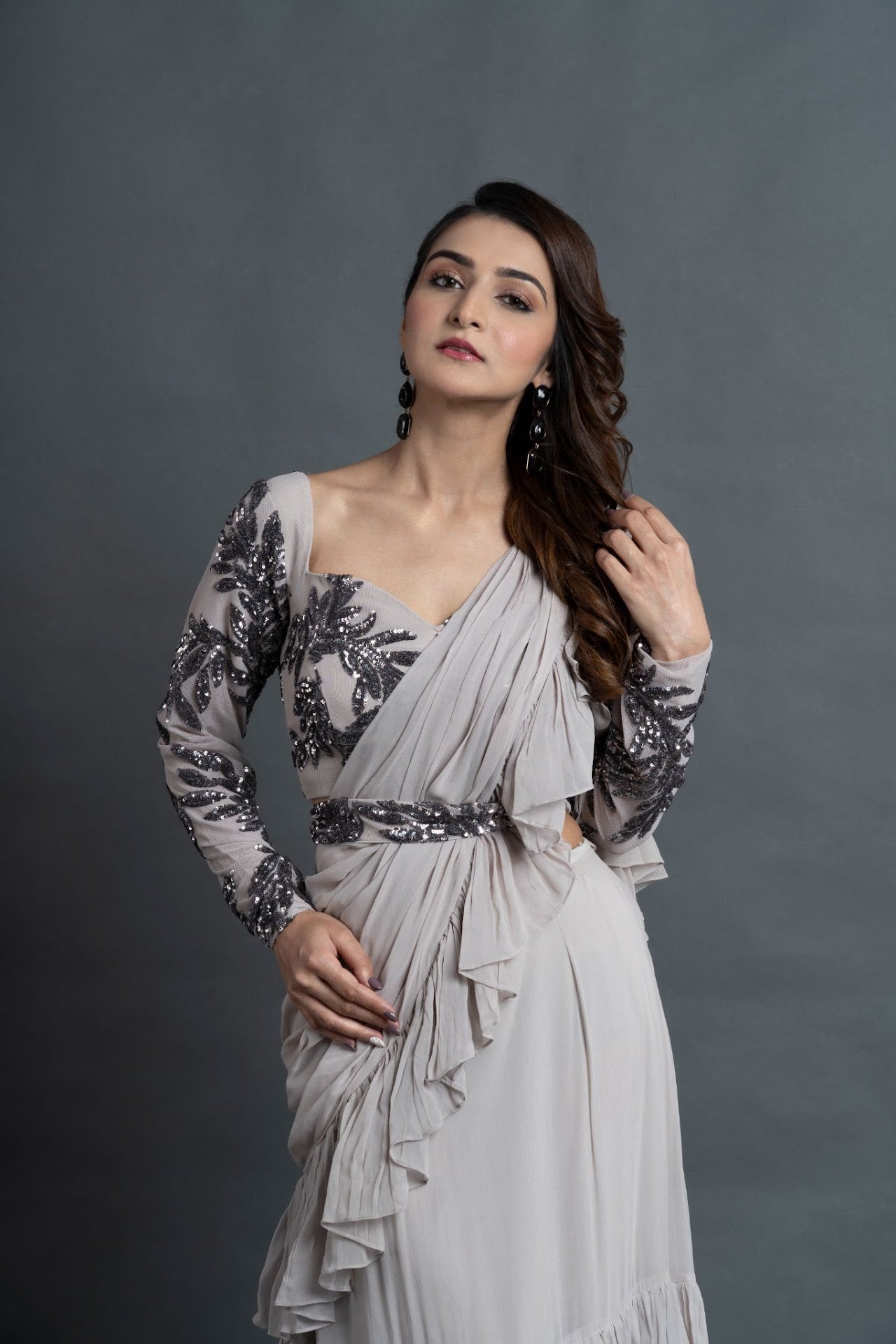 The Ash White/Grey georgette pre-draped saree, enhanced with subtle sequin work, adds a touch of sparkle and sophistication. Paired with a soft net base blouse featuring delicate sequin embellishments, this ensemble creates a perfect balance of elegance and modern glamour.