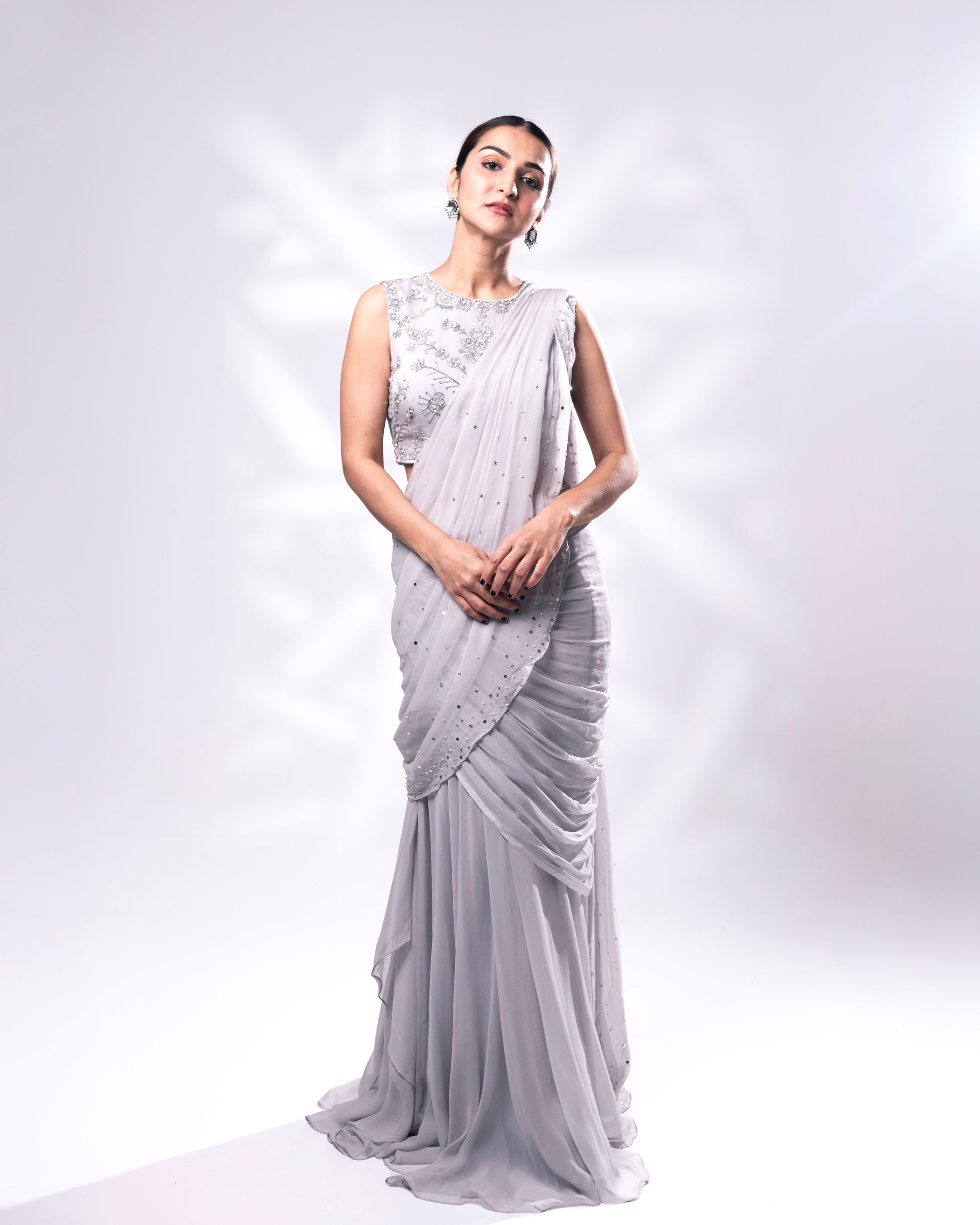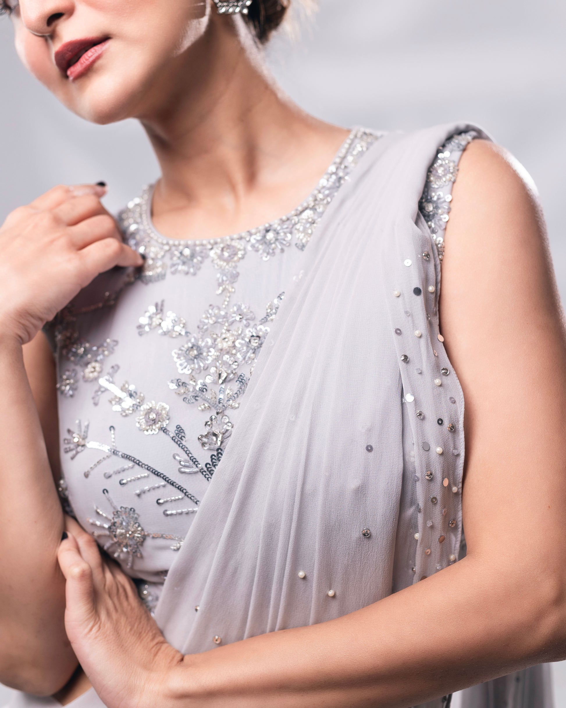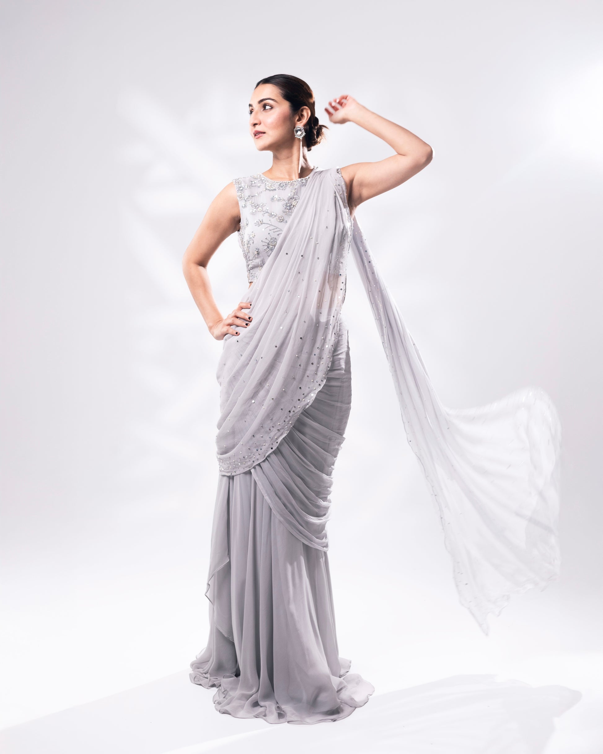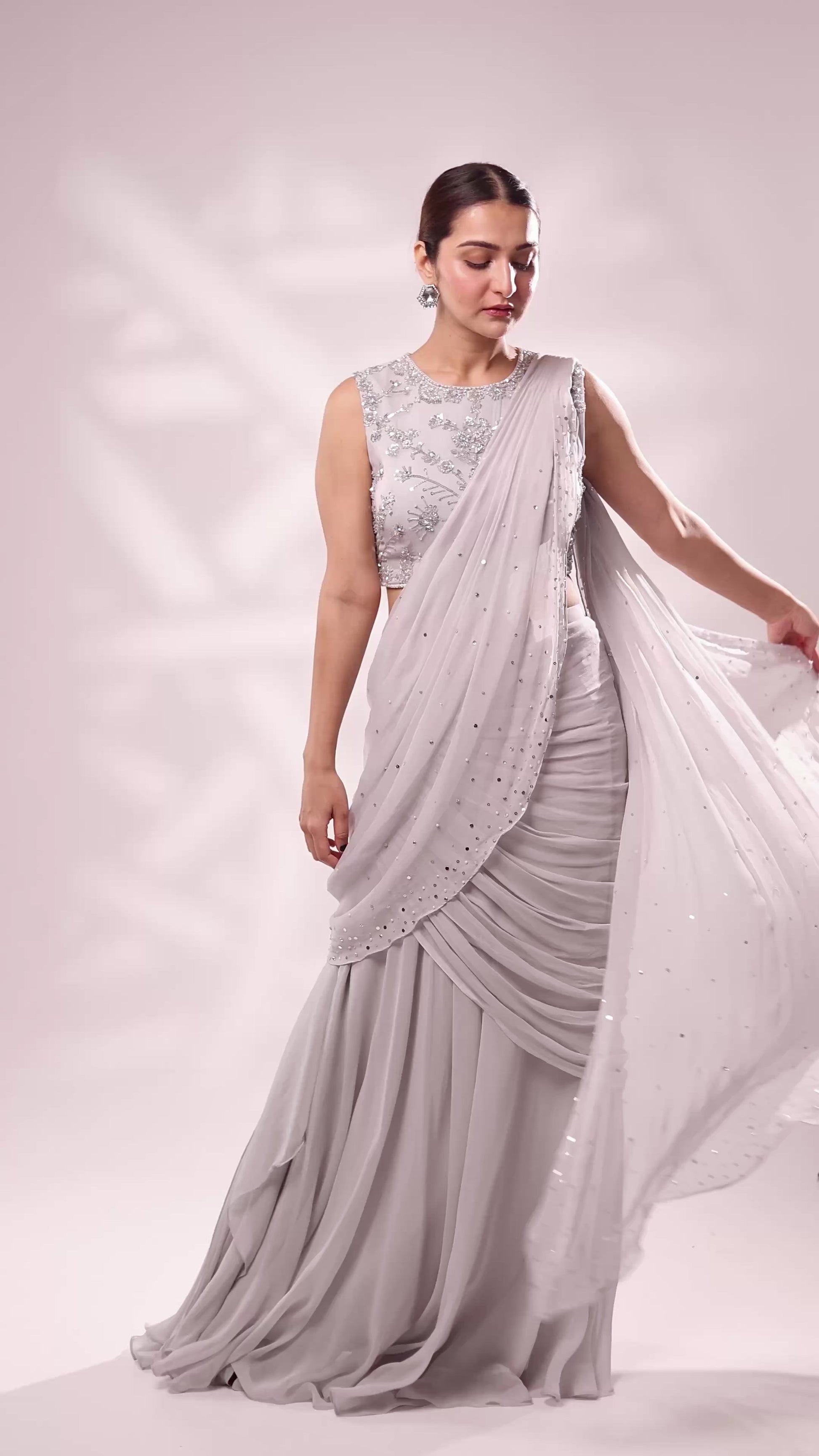 Tara georgette saree shimmers with delicate sitara work all over the pallu, creating a celestial flow with every move. Paired with a statement blouse adorned in intricate beads and crystals this ensemble is all about modern glam with traditional charm.