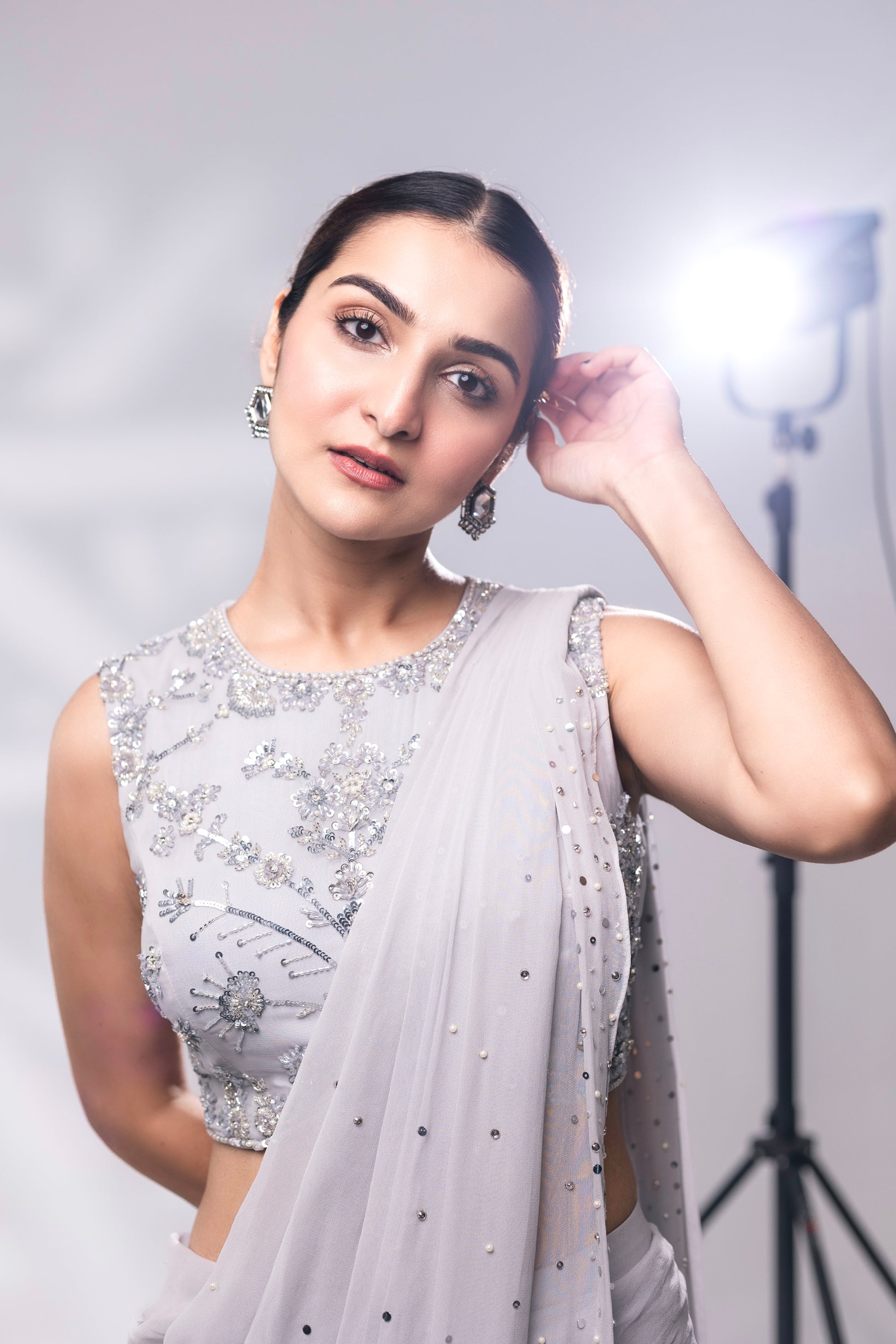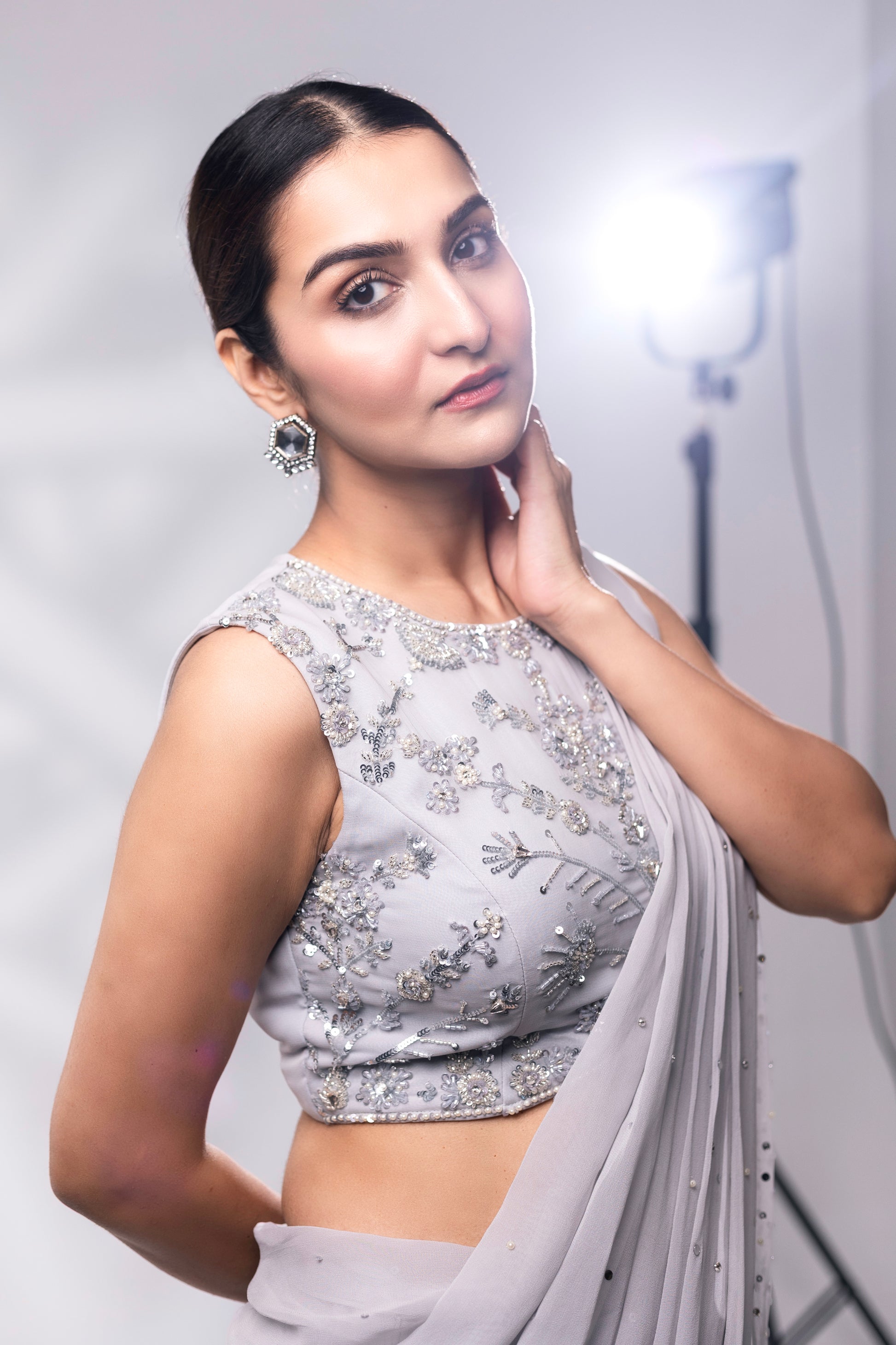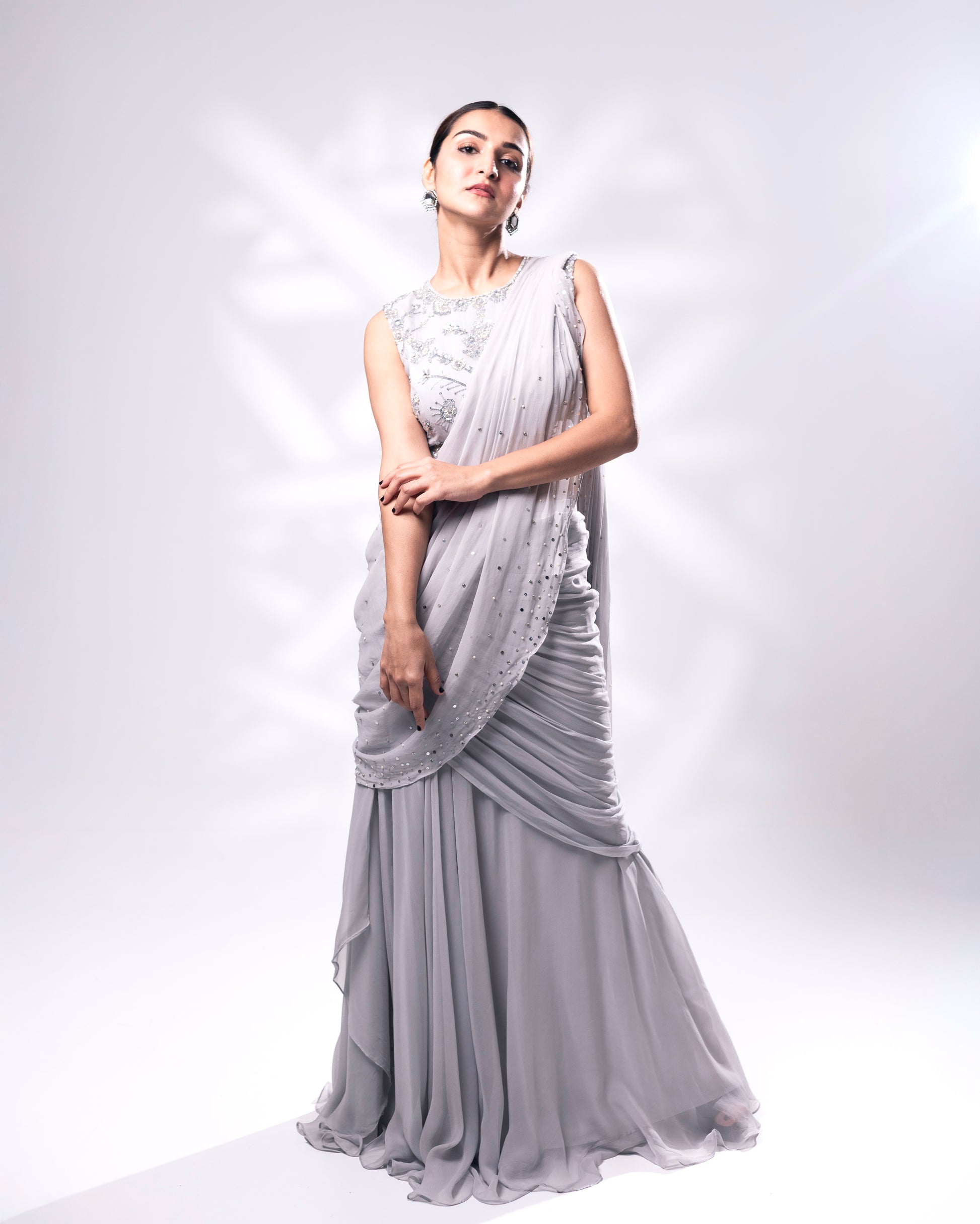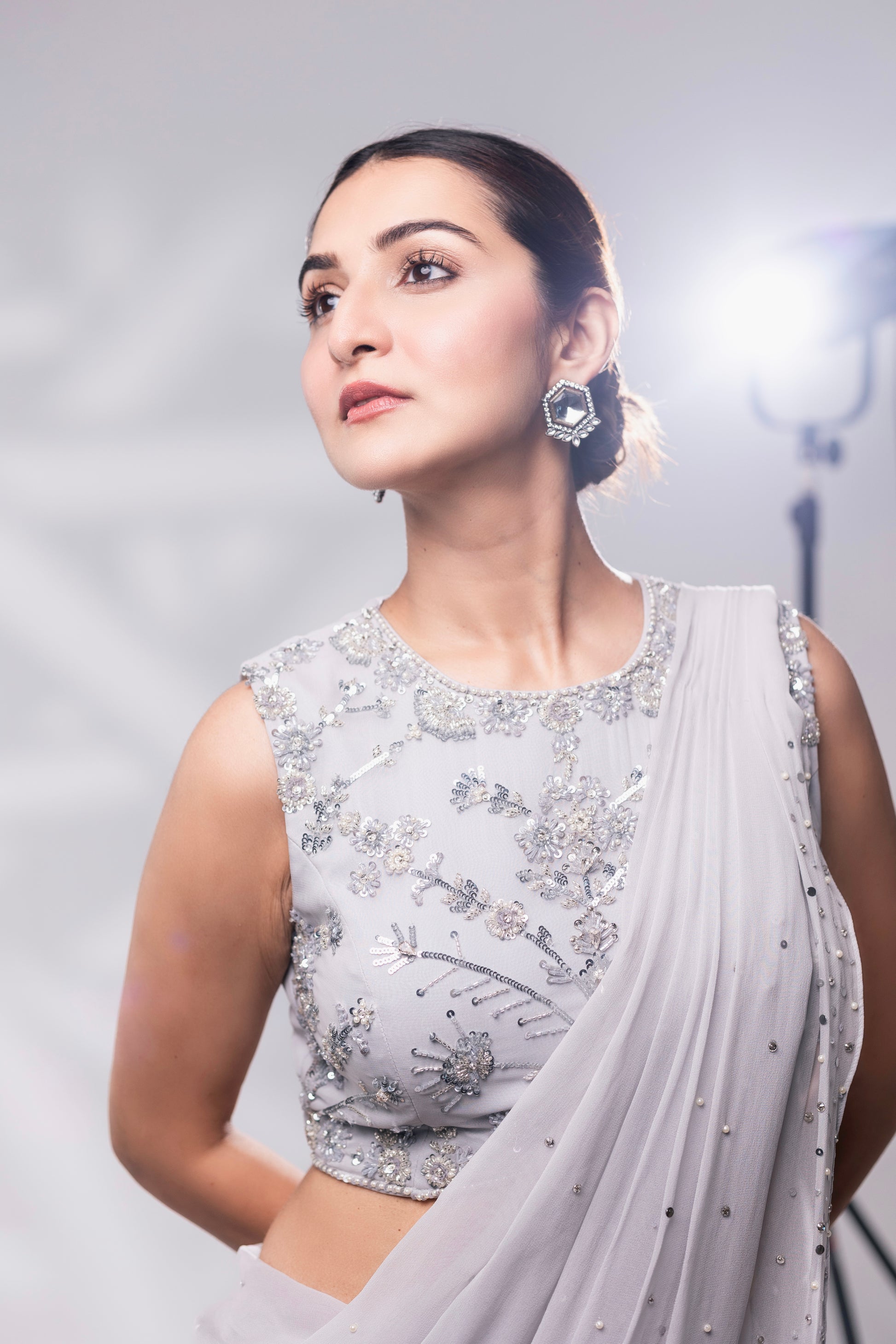 Tara georgette saree shimmers with delicate sitara work all over the pallu, creating a celestial flow with every move. Paired with a statement blouse adorned in intricate beads and crystals this ensemble is all about modern glam with traditional charm.