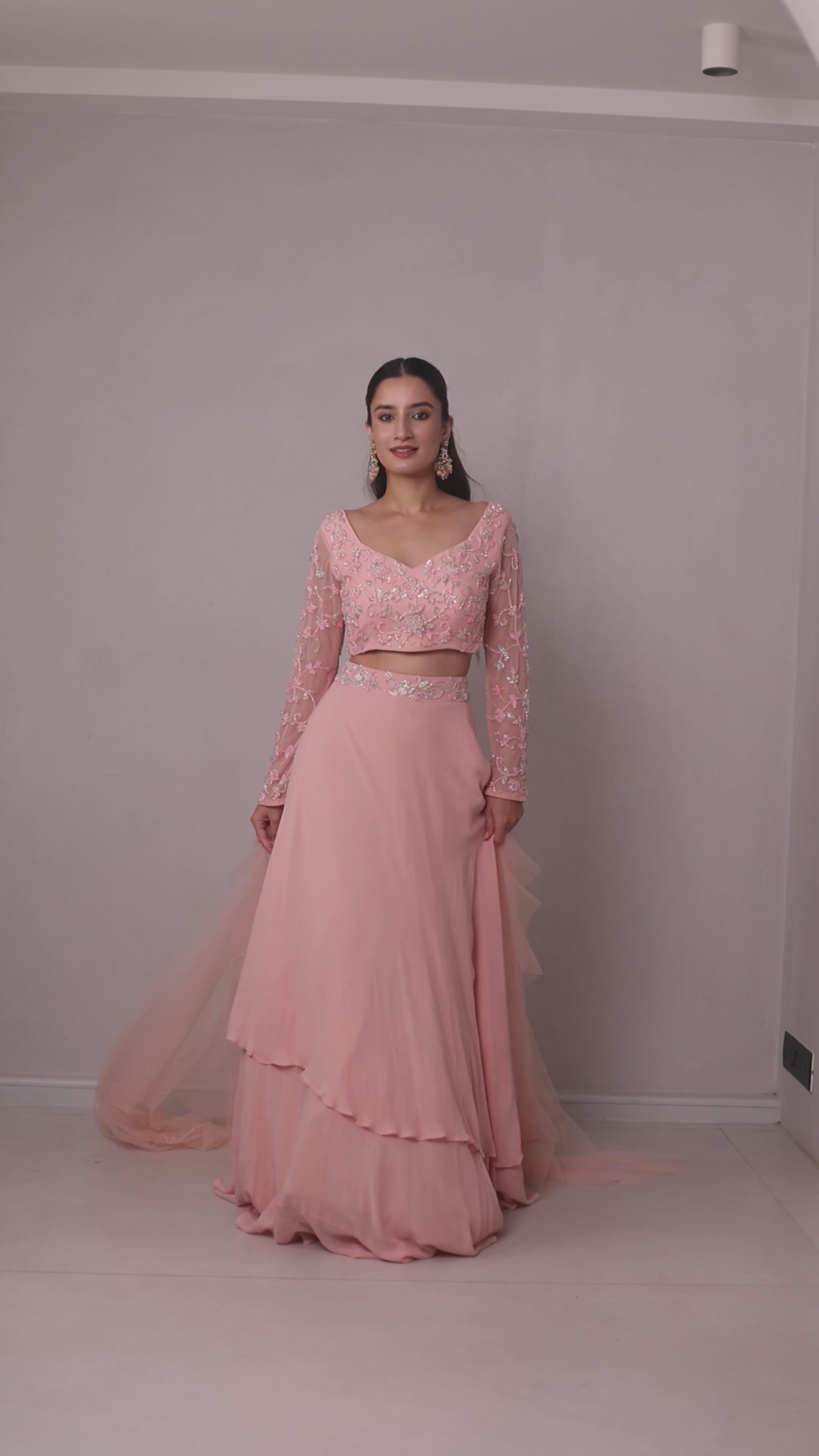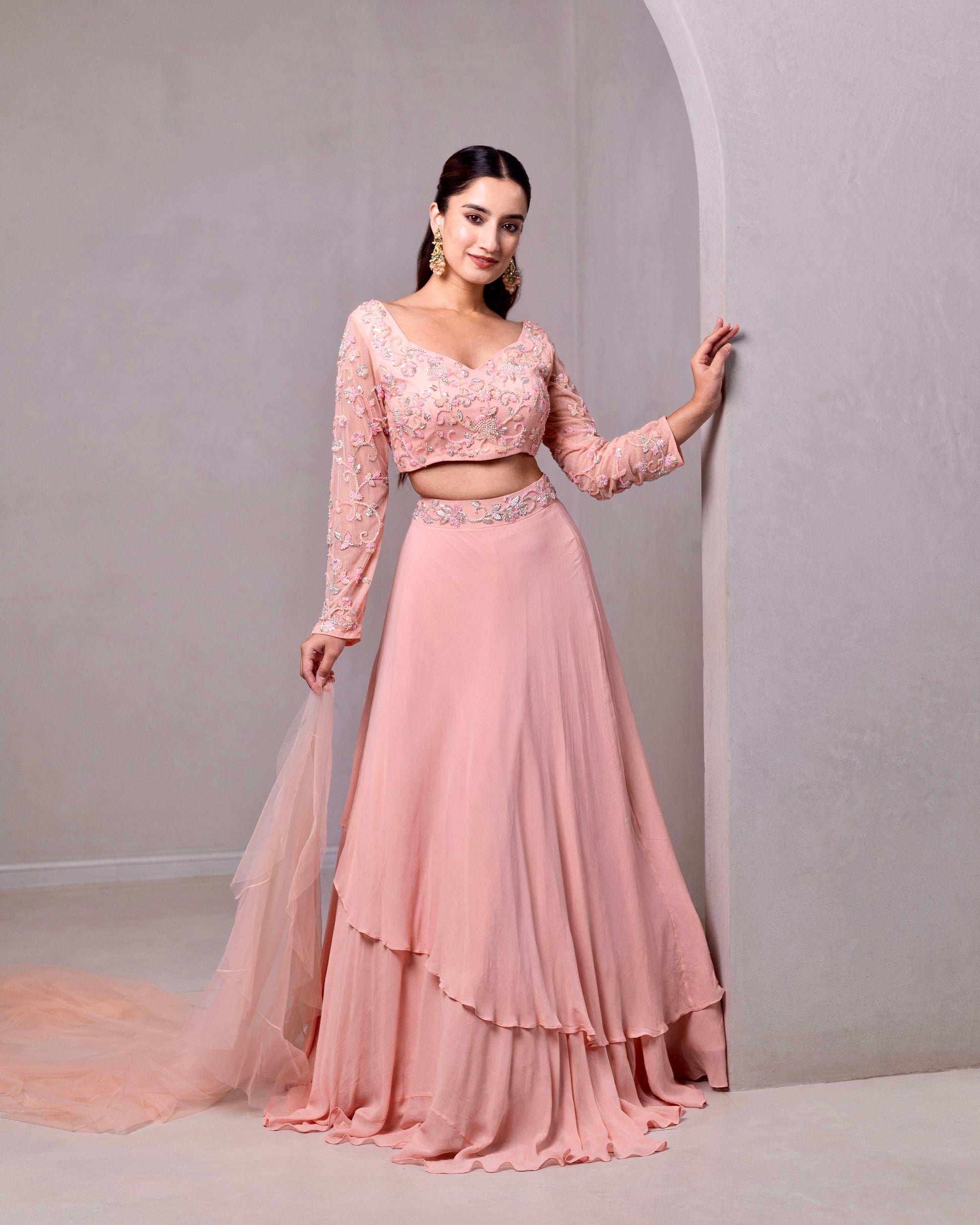 The Tiffany lehenga is a beautiful blend of georgette and soft net in a two layered lehenga designed to flow with an ethereal, dream-like quality. The accompanying soft net blouse is intricately embroidered with cutdana, beads, and pearls, bringing timeless elegance and luxurious detail to the ensemble.