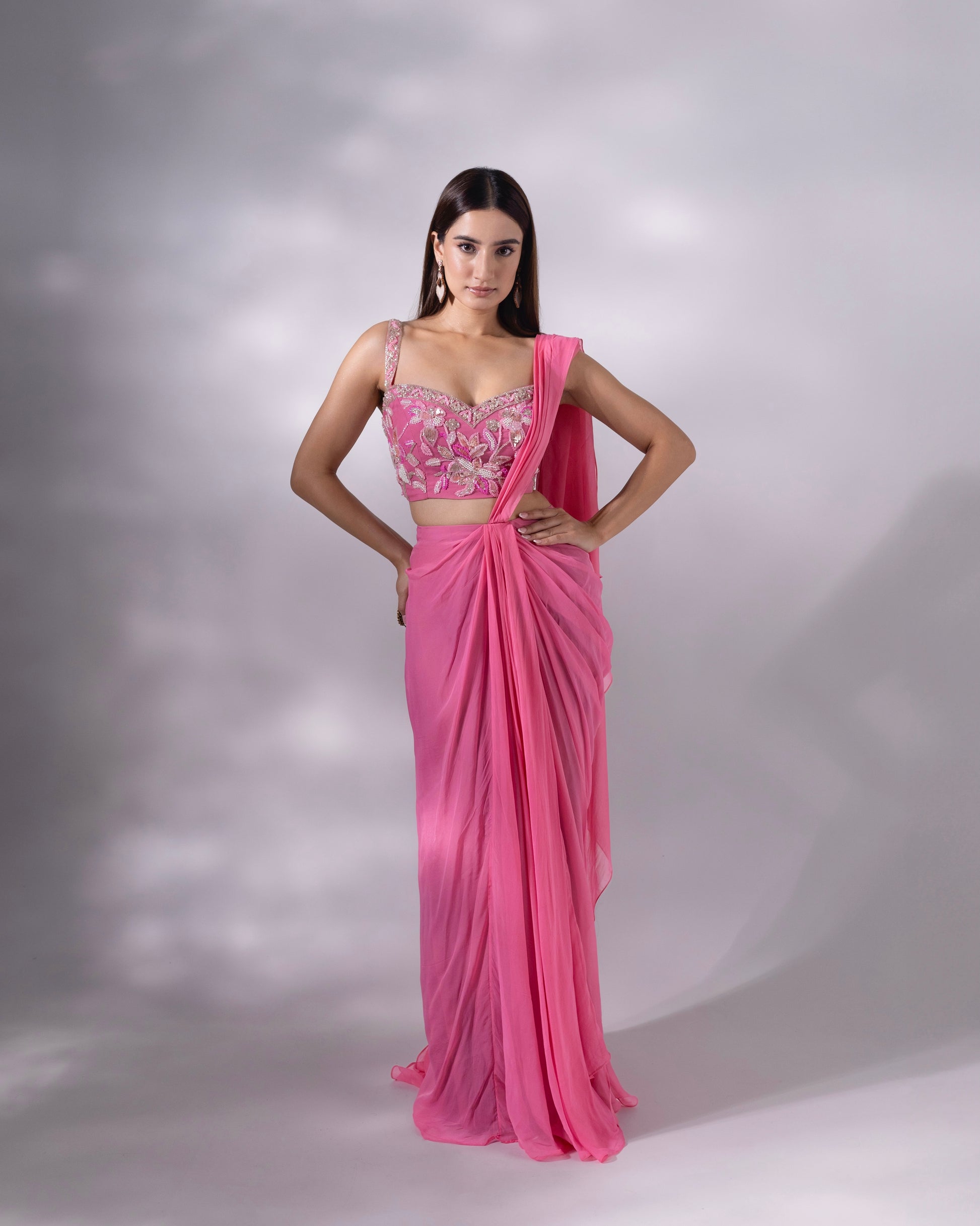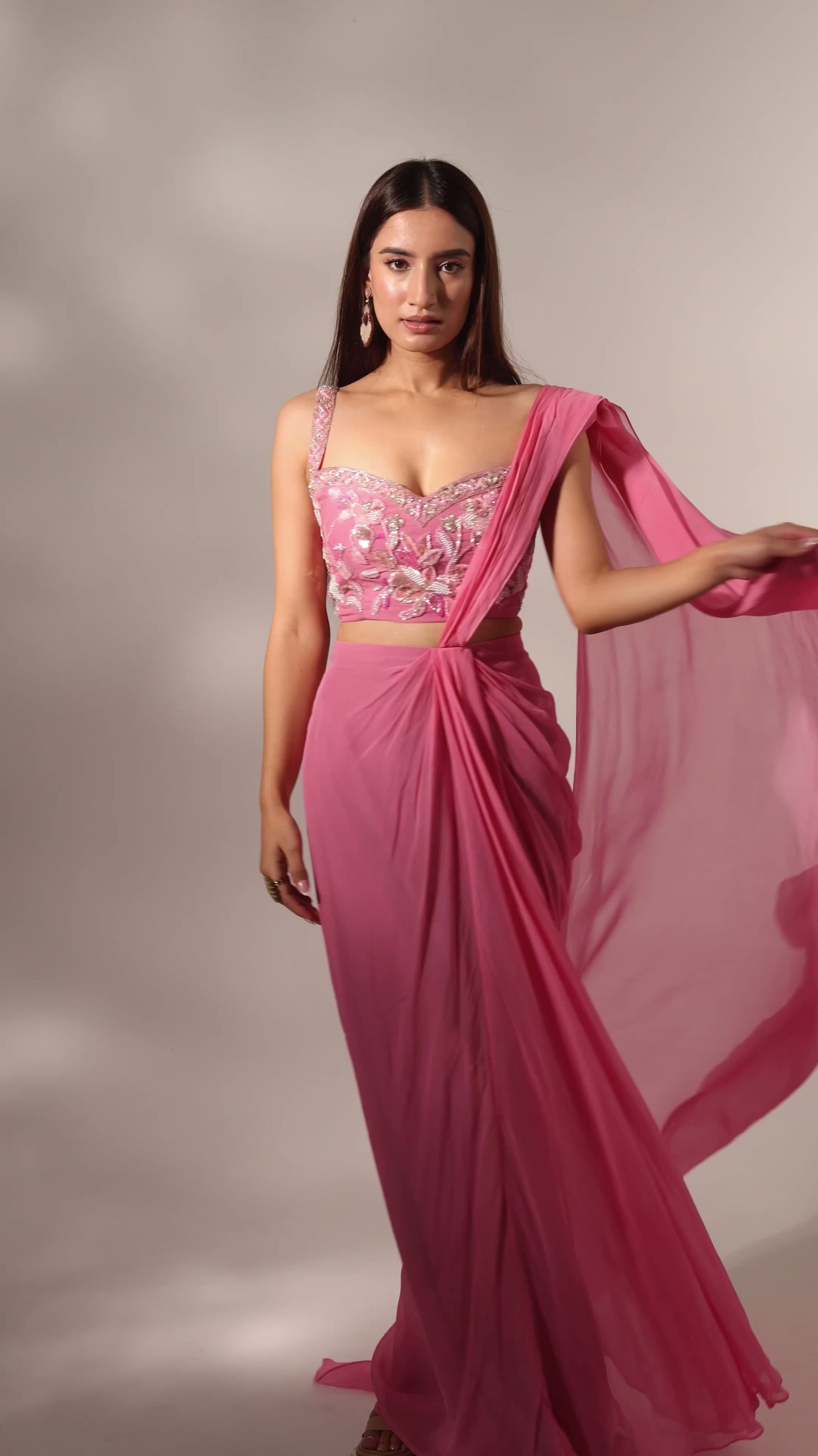 A Tulip Saree in soft Organza with a Georgette Blouse featuring Cutdana, Beads, and Pearl Embroidery offers an elegant and graceful look, perfect for weddings, receptions, or special occasions. The delicate fabric and intricate embroidery create a beautiful, timeless ensemble.