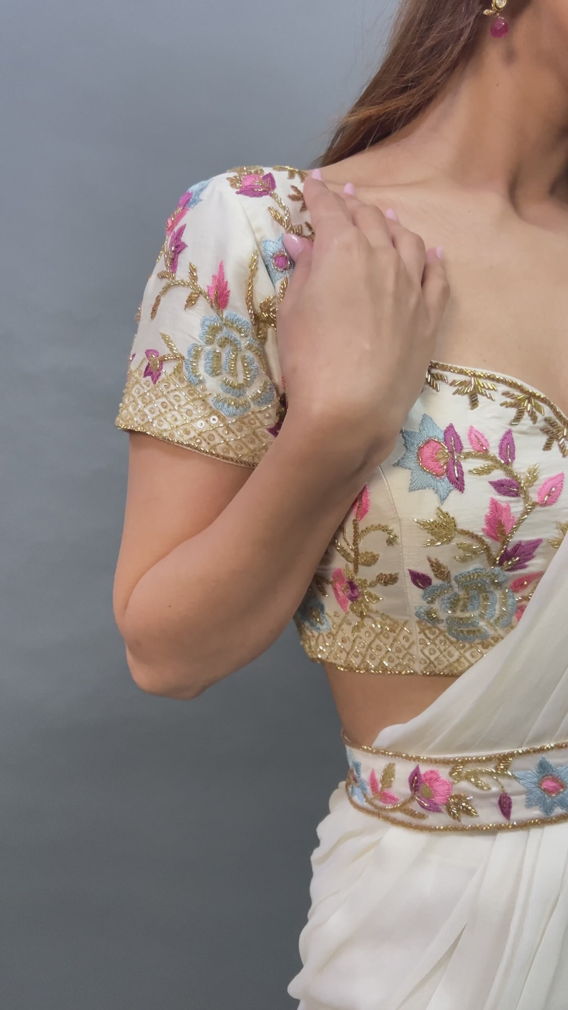 The Vivacious White organza and georgette pre-draped saree offers a fresh, graceful look with its delicate, flowing fabric. The silk blouse, adorned with intricate multi-color thread and cutdana embroidery, adds a lively and artistic touch. This ensemble beautifully combines timeless white with a burst of color and detailed craftsmanship.