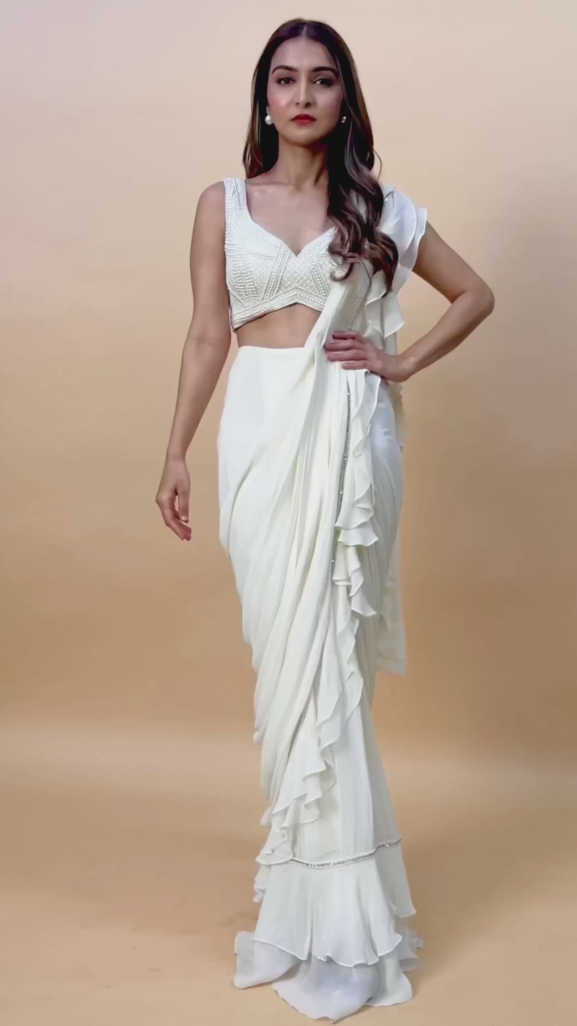 This Lily White georgette pre-draped saree, with a sparkling cutdana border, creates a flawless, feminine look. Paired with a silk blouse adorned with beautiful bead, pearl, and cutdana embroidery, this ensemble is perfect for those seeking a graceful yet luxurious style for weddings or festive gatherings.