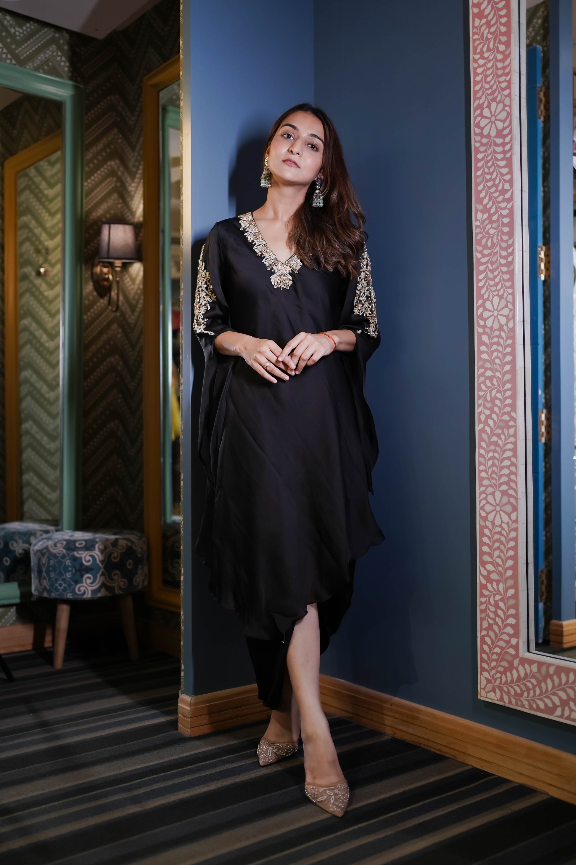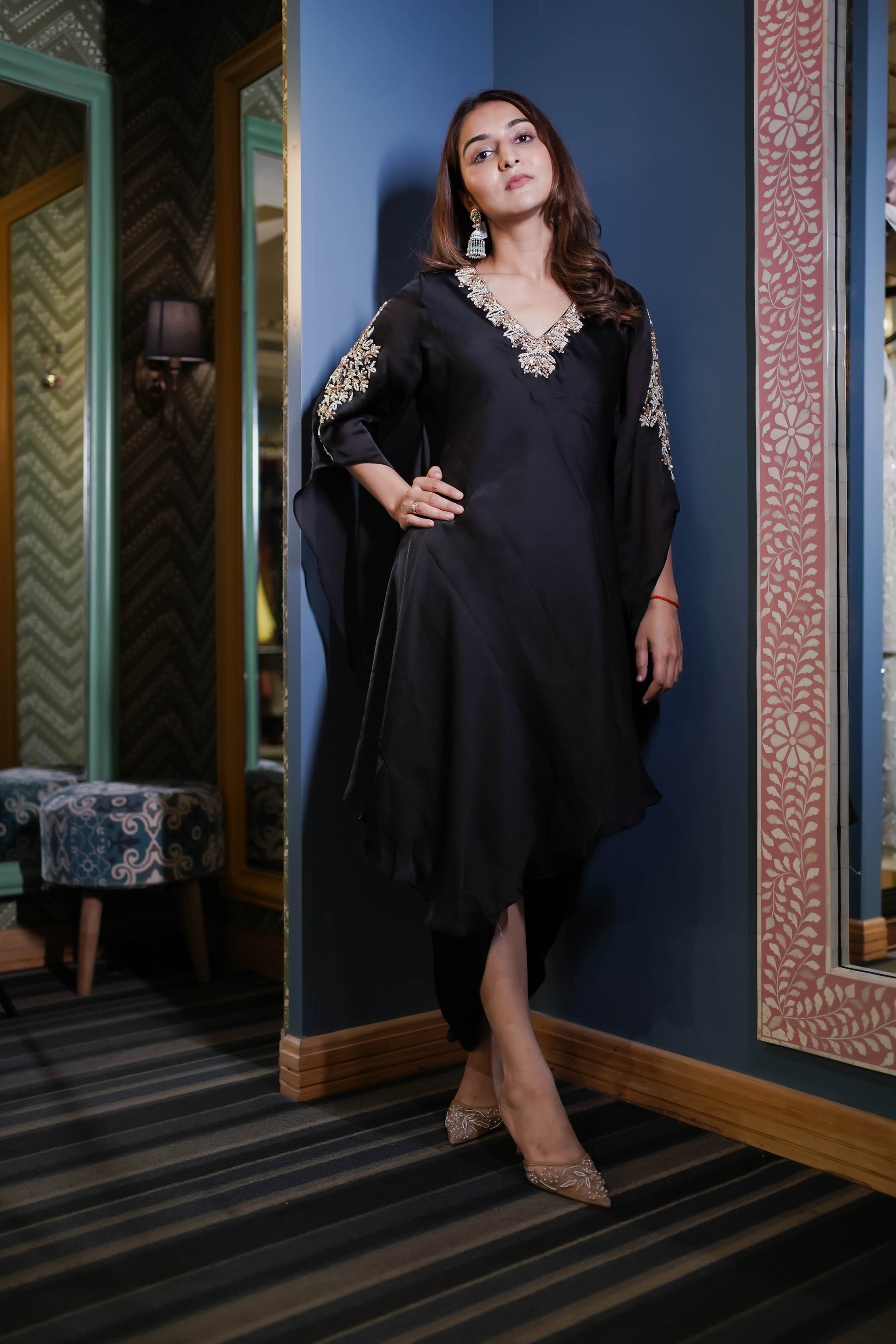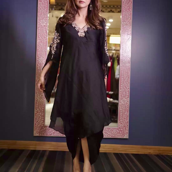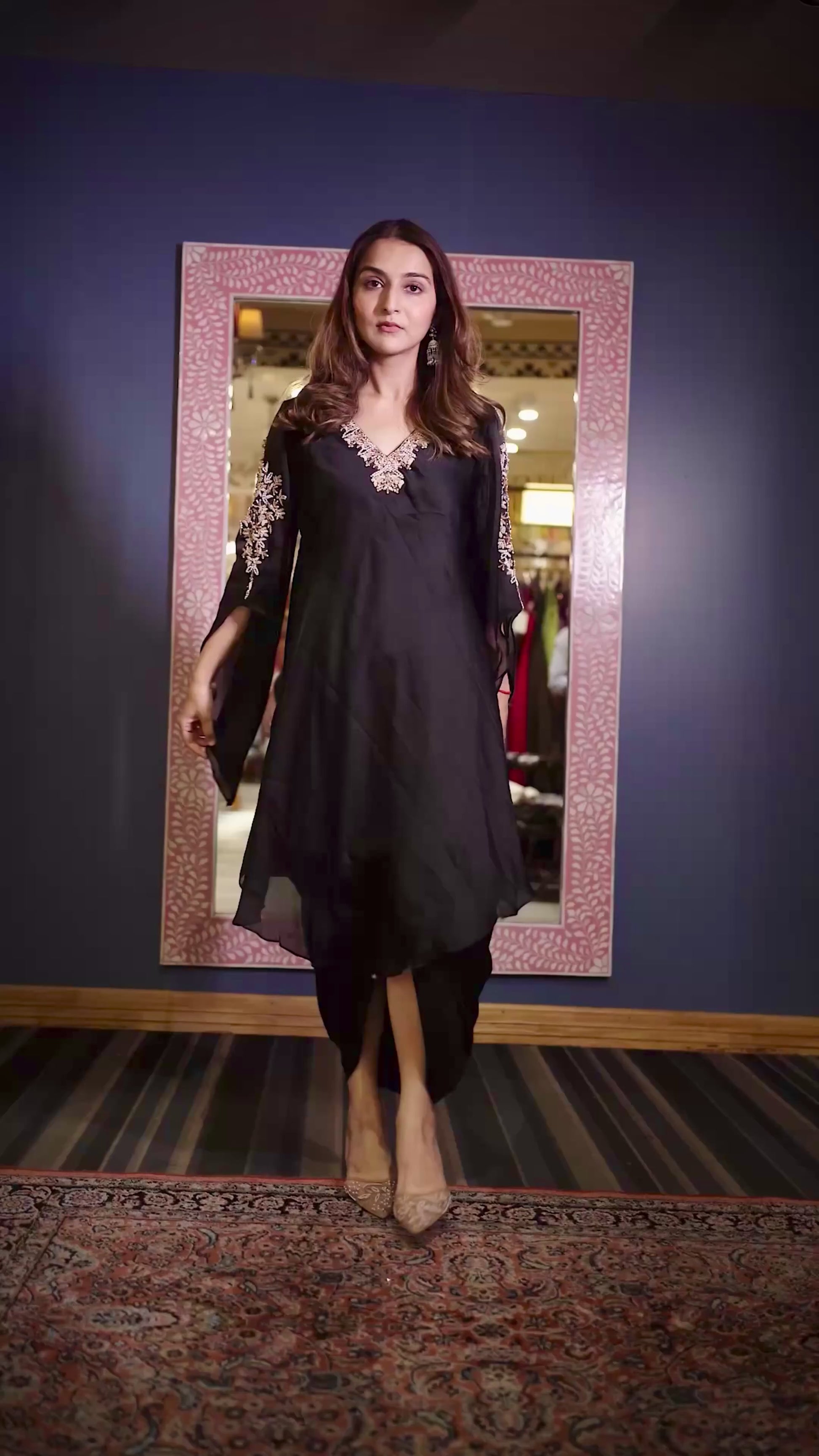 Presenting ZYRA - a vision in satin that blends contemporary silhouettes with timeless grace. Designed as a two-piece suit, it features a fluid dhoti style skirt paired with a high-low kurti, creating a balanced of movement, comfort, and effortless charm. What makes zyra truly special is the delicate artistry - golden and mirror embalishments handwork around the neckline and sleeves, catching the light with every gesture. It's a piece that whisper elegance, yet makes it's presence felt. Zyra is not just an outfit, it's a mood - for the women who embrace subtle luxury, values fine details, and carries herself with quiet confidence.